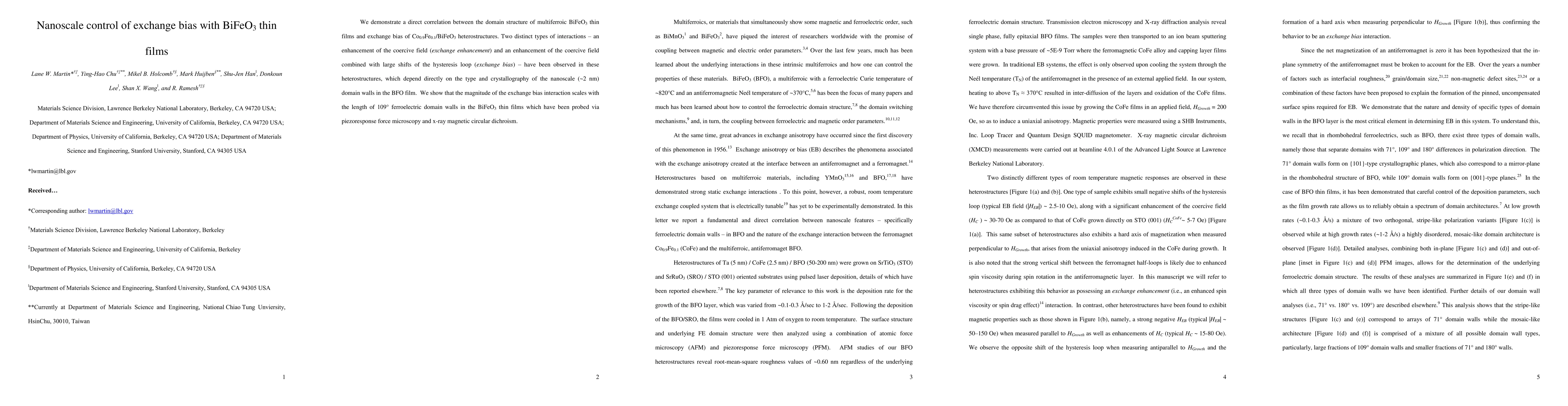 This study demonstrates a direct link between nanoscale domain structure in BiFeO3 thin films and the exchange bias in Co0.9Fe0.1/BiFeO3 heterostructures, showing enhanced coercive fields and large hysteresis loop shifts influenced by 2 nm domain walls, with the interaction magnitude correlating with the length of 109 degree ferroelectric domain walls.