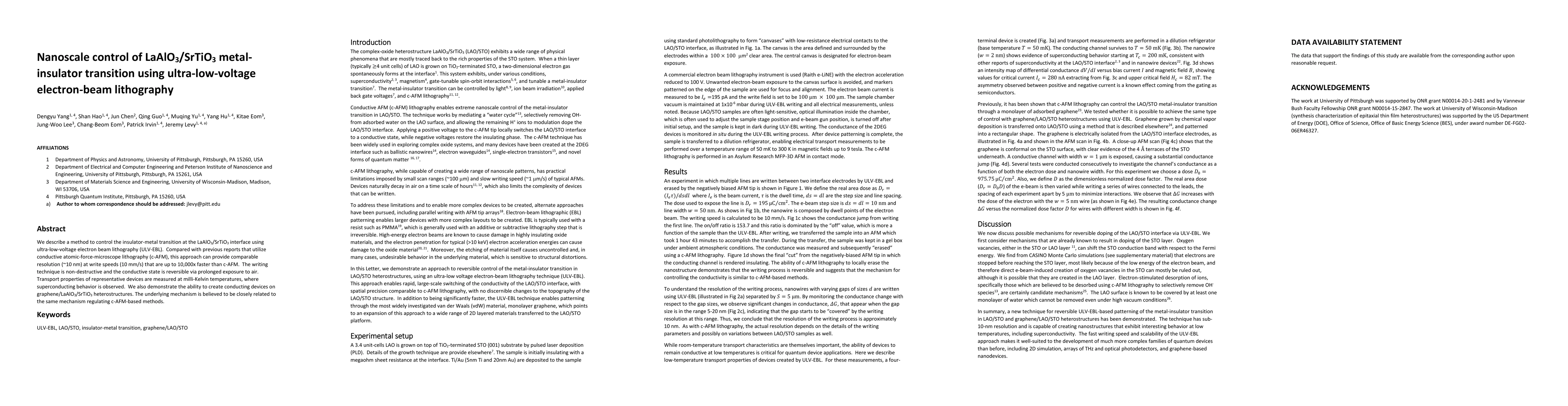 This paper details a novel method for controlling the metal-insulator transition at the LaAlO3/SrTiO3 interface using ultra-low-voltage electron beam lithography, achieving high resolution and fast write speeds with reversible conductive state changes, and observing superconducting behavior at low temperatures.
