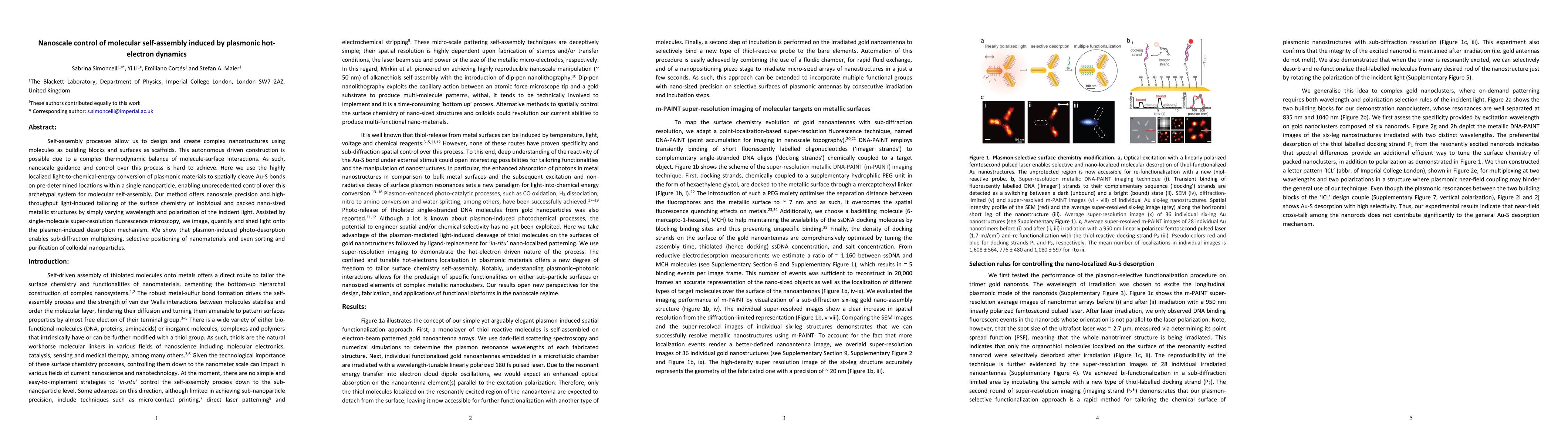 Self-assembly processes allow us to design and create complex nanostructures using molecules as building blocks and surfaces as scaffolds. This autonomous driven construction is possible due to a complex thermodynamic balance of molecule-surface interactions. As such, nanoscale guidance and control over this process is hard to achieve. Here we use the highly localized light-to-chemical-energy conversion of plasmonic materials to spatially cleave Au-S bonds on pre-determined locations within a single nanoparticle, enabling unprecedented control over this archetypal system for molecular self-assembly. Our method offers nanoscale precision and high-throughput light-induced tailoring of the surface chemistry of individual and packed nano-sized metallic structures by simply varying wavelength and polarization of the incident light. Assisted by single-molecule super-resolution fluorescence microscopy, we image, quantify and shed light onto the plasmon-induced desorption mechanism. We show that plasmon-induced photo-desorption enables sub-diffraction multiplexing, selective positioning of nanomaterials and even sorting and purification of colloidal nanoparticles.