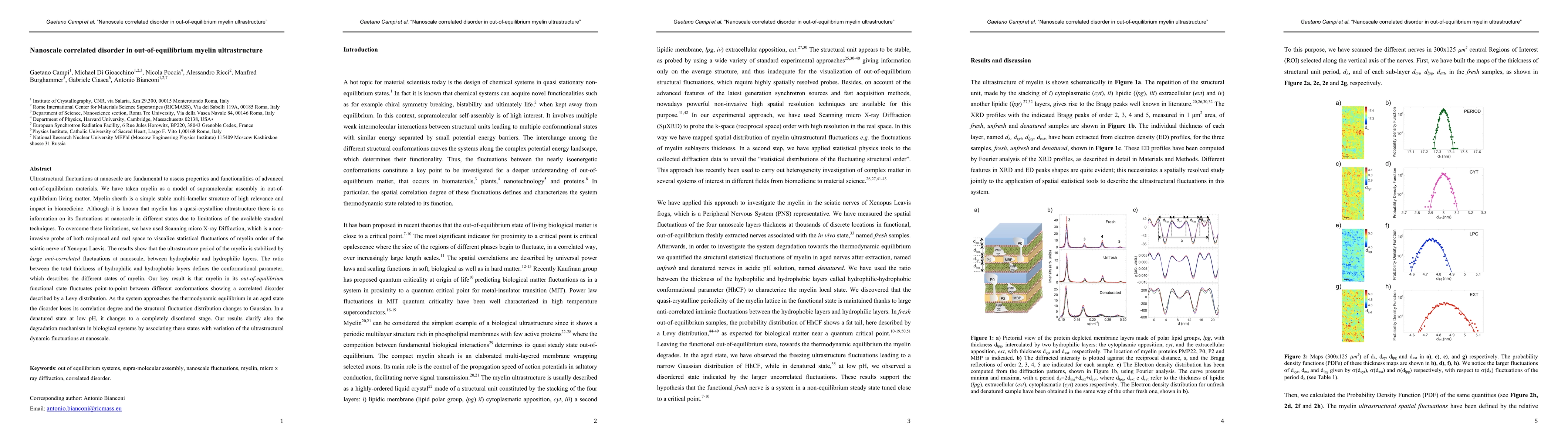 Researchers studied myelin ultrastructure using Scanning micro X-ray Diffraction, finding that it fluctuates between different conformations with correlated disorder, which changes as the system approaches equilibrium or becomes denatured.
