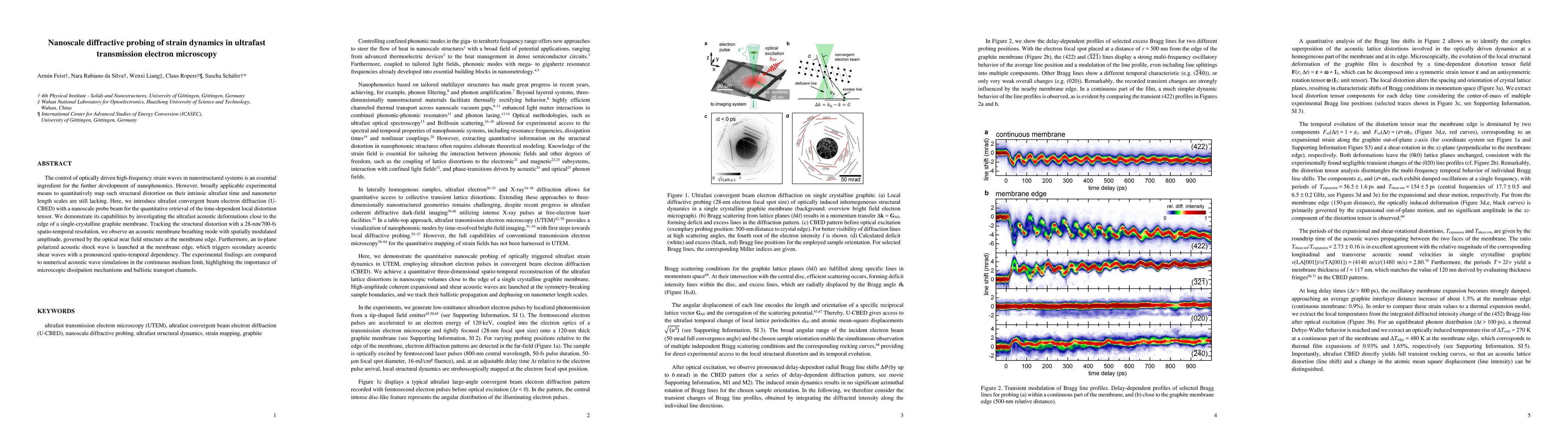 The control of optically driven high-frequency strain waves in nanostructured systems is an essential ingredient for the further development of nanophononics. However, broadly applicable experimental means to quantitatively map such structural distortion on their intrinsic ultrafast time and nanometer length scales are still lacking. Here, we introduce ultrafast convergent beam electron diffraction (U-CBED) with a nanoscale probe beam for the quantitative retrieval of the time-dependent local distortion tensor. We demonstrate its capabilities by investigating the ultrafast acoustic deformations close to the edge of a single-crystalline graphite membrane. Tracking the structural distortion with a 28-nm/700-fs spatio-temporal resolution, we observe an acoustic membrane breathing mode with spatially modulated amplitude, governed by the optical near field structure at the membrane edge. Furthermore, an in-plane polarized acoustic shock wave is launched at the membrane edge, which triggers secondary acoustic shear waves with a pronounced spatio-temporal dependency. The experimental findings are compared to numerical acoustic wave simulations in the continuous medium limit, highlighting the importance of microscopic dissipation mechanisms and ballistic transport channels.