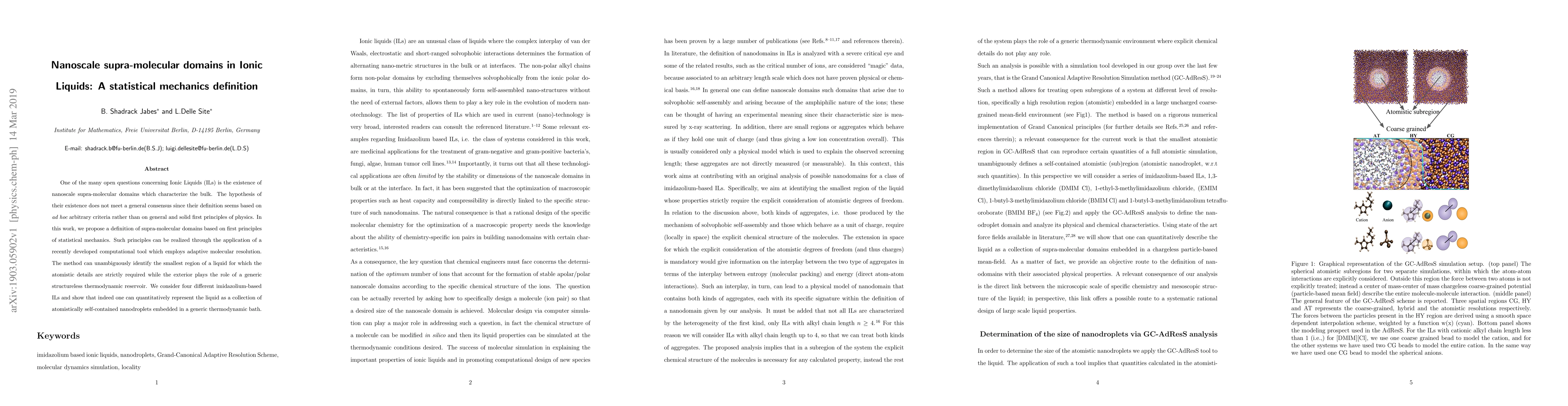 This paper proposes a statistical mechanics definition for nanoscale supramolecular domains in ionic liquids, using adaptive molecular resolution to identify regions requiring atomistic detail. The method reveals imidazolium-based ILs as collections of nanodroplets embedded in a thermodynamic bath, providing a quantitative basis for heterogeneity.