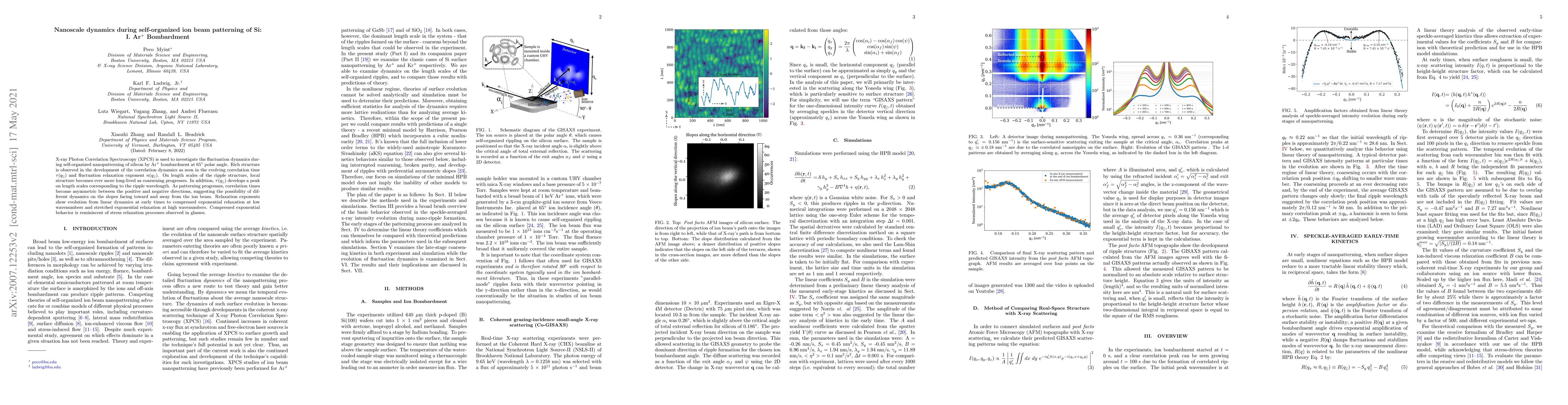 Coherent grazing-incidence small-angle X-ray scattering is used to investigate the average kinetics and the fluctuation dynamics during self-organized nanopatterning of silicon by Ar$^+$ bombardment at 65$^{\circ}$ polar angle. At early times, the surface behavior can be understood within the framework of linear theory. The transition away from the linear theory behavior is observed in the dynamics through the intensity correlation function. It quickly evolves to exhibit stretched exponential decay on short length scales and compressed exponential decay on length scales corresponding the dominant structural length scale - the ripple wavelength. The correlation times also peak strongly at the ripple length scale. This behavior has notable similarities but also significant differences with the phenomenon of de Gennes narrowing. Overall, this dynamics behavior is found to be consistent with simulations of a nonlinear growth model.