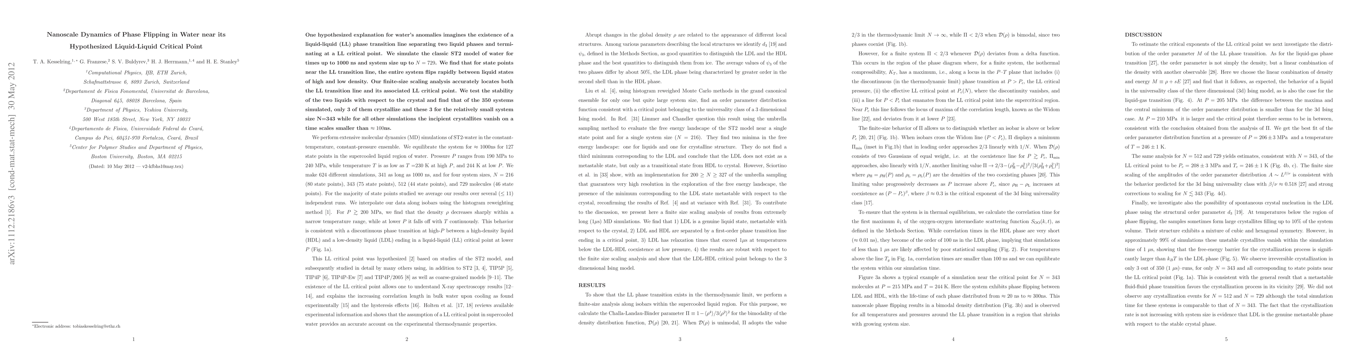 This paper investigates the nanoscale dynamics of phase flipping in water near its hypothesized liquid-liquid critical point, revealing that the ST2 model exhibits transitions between high and low density liquid states. The study finds that crystallites melt on nanosecond timescales in the critical region, and a finite-size scaling analysis accurately locates the liquid-liquid coexistence line and critical point.