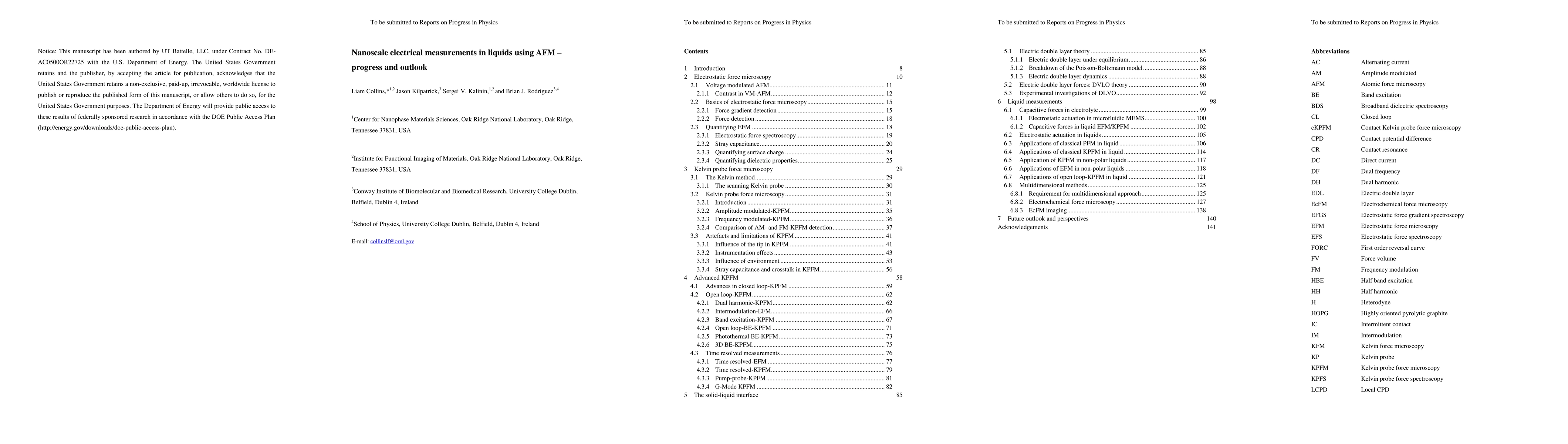 Fundamental mechanisms of energy storage, corrosion, sensing, and multiple biological functionalities are directly coupled to electrical processes and ionic dynamics at solid-liquid interfaces. In many cases, these processes are spatially inhomogeneous taking place at grain boundaries, step edges, point defects, ion channels, etc. and possess complex time and voltage dependent dynamics. This necessitates time-resolved and real-space probing of these phenomena. In this review, we discuss the applications of force-sensitive voltage modulated scanning probe microscopy (SPM) for probing electrical phenomena at solid-liquid interfaces. We first describe the working principles behind electrostatic and Kelvin Probe Force microscopies (EFM & KPFM) at the gas-solid interface, review the state of the art in advanced KPFM methods and developments to (i) overcome limitations of classical KPFM, (i) expand the information accessible from KPFM, and (iii) extend KPFM operation to liquid environments. We briefly discuss the theoretical framework of the electrical double layer (EDL) forces and dynamics, the implications and breakdown of classical EDL models for highly charged interfaces, or under high ion concentrations, and briefly describe recent modifications of the classical EDL theory relevant for understanding nanoscale electrical measurements at the solid-liquid interface. We further review the latest achievements in mapping surface charge, dielectric constants, and electrodynamic and electrochemical processes in liquids. Finally, we outline the key challenges and opportunities that exist in the field of nanoscale electrical measurements in liquid as well as provide a roadmap for the future development of liquid KPFM.