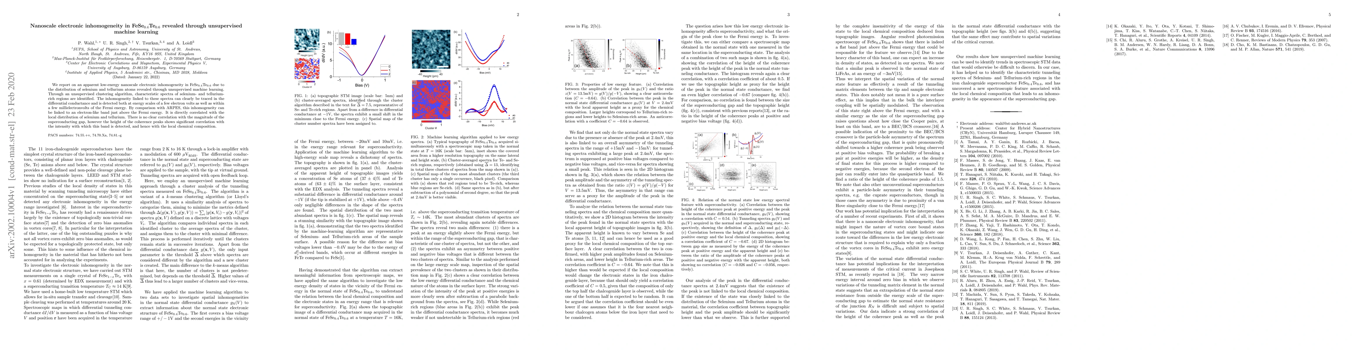 We report on an apparent low-energy nanoscale electronic inhomogeneity in FeSe$_{0.4}$Te$_{0.6}$ due to the distribution of selenium and tellurium atoms revealed through unsupervised machine learning. Through an unsupervised clustering algorithm, characteristic spectra of selenium- and tellurium-rich regions are identified. The inhomogeneity linked to these spectra can clearly be traced in the differential conductance and is detected both at energy scales of a few electron volts as well as within a few millielectronvolts of the Fermi energy. By comparison with ARPES, this inhomogeneity can be linked to an electron-like band just above the Fermi energy. It is directly correlated with the local distribution of selenium and tellurium. There is no clear correlation with the magnitude of the superconducting gap, however the height of the coherence peaks shows significant correlation with the intensity with which this band is detected, and hence with the local chemical composition.