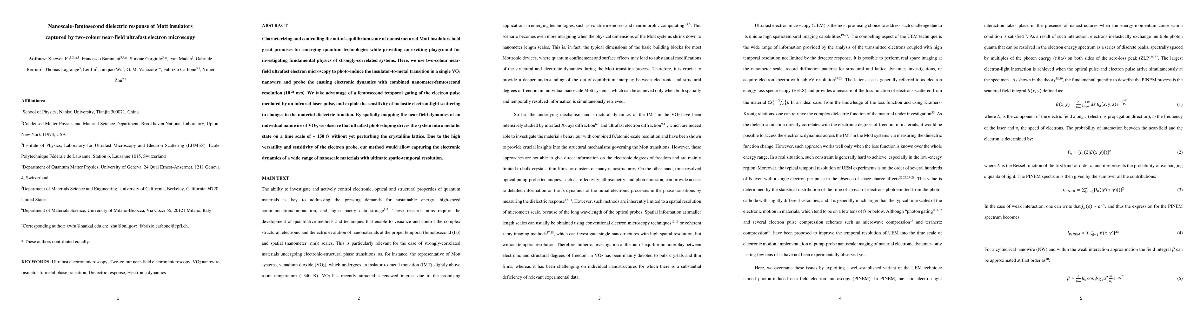 This paper investigates the nanoscale-femtosecond dielectric response of Mott insulators using two-colour near-field ultrafast electron microscopy, demonstrating the insulator-to-metal transition in VO2 nanowires and capturing the ultrafast electronic dynamics with nanometer-femtosecond resolution. The method reveals that ultrafast photo-doping induces a metallic state within 150 fs without affecting the lattice structure.