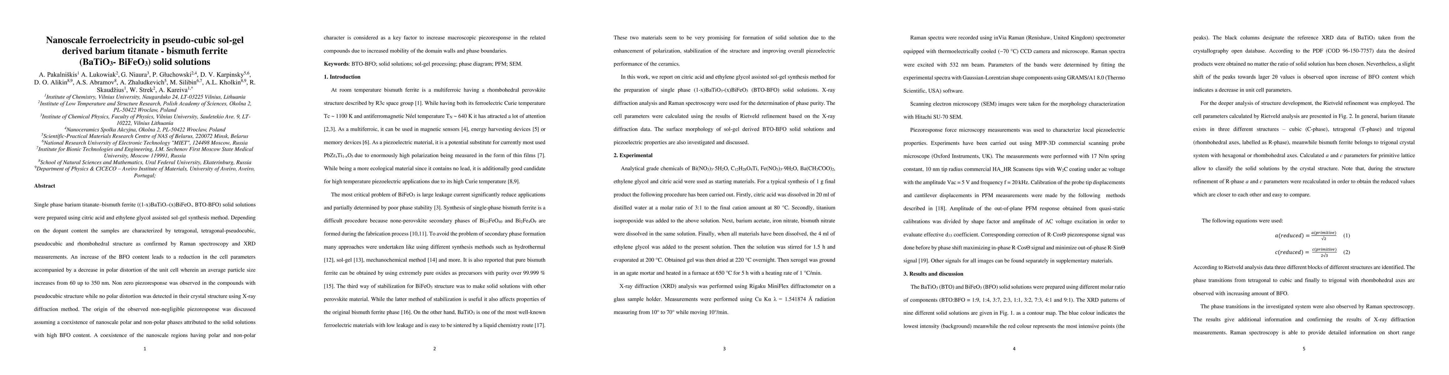 This study investigates nanoscale ferroelectricity in pseudo-cubic sol-gel derived barium titanate-bismuth ferrite solid solutions, revealing a coexistence of nanoscale polar and non-polar phases that enhances macroscopic piezoresponse due to increased domain wall mobility. The solid solutions exhibit varied structures and particle sizes depending on bismuth ferrite content, with non-zero piezoresponse observed in pseudocubic structures.