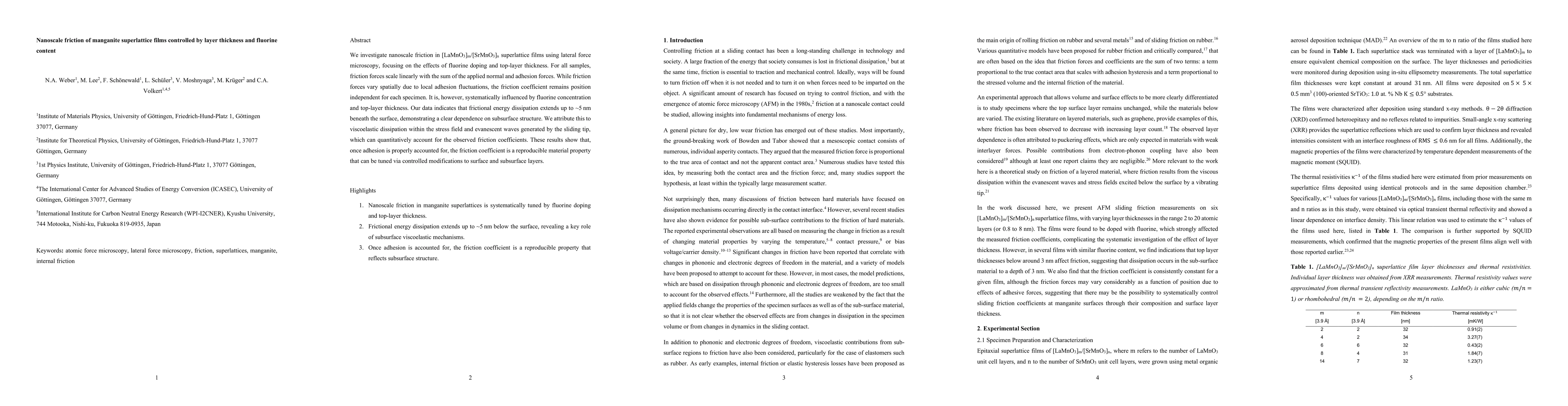 We investigate nanoscale friction in [LaMnO3]m/[SrMnO3]n superlattice films using lateral force microscopy, focusing on the effects of fluorine doping and top-layer thickness. For all samples, friction forces scale linearly with the sum of the applied normal and adhesion forces. While friction forces vary spatially due to local adhesion fluctuations, the friction coefficient remains position independent for each specimen. It is, however, systematically influenced by fluorine concentration and top-layer thickness. Our data indicates that frictional energy dissipation extends up to 5 nm beneath the surface, demonstrating a clear dependence on subsurface structure. We attribute this to viscoelastic dissipation within the stress field and evanescent waves generated by the sliding tip, which can quantitatively account for the observed friction coefficients. These results show that, once adhesion is properly accounted for, the friction coefficient is a reproducible material property that can be tuned via controlled modifications to surface and subsurface layers.