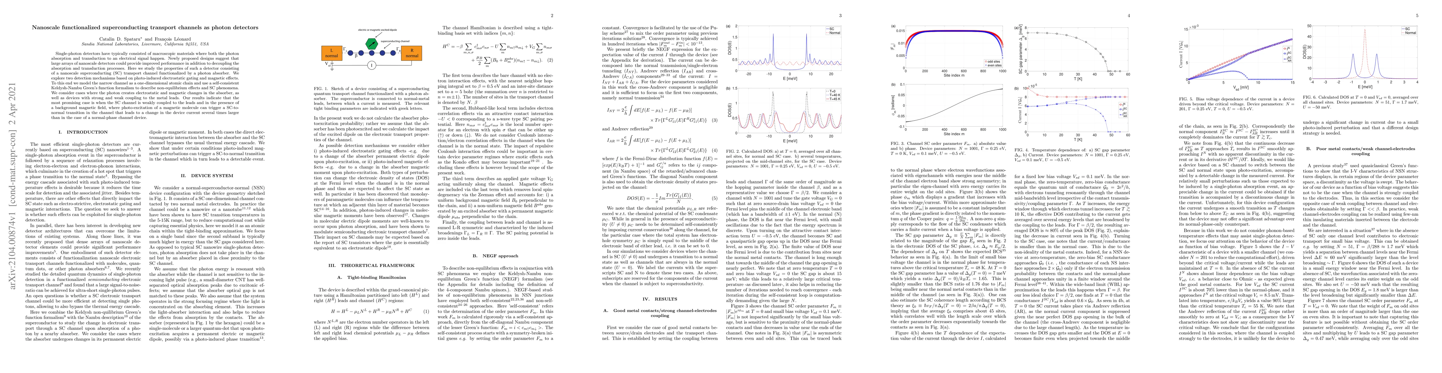 Single-photon detectors have typically consisted of macroscopic materials where both the photon absorption and transduction to an electrical signal happen. Newly proposed designs suggest that large arrays of nanoscale detectors could provide improved performance in addition to decoupling the absorption and transduction processes. Here we study the properties of such a detector consisting of a nanoscale superconducting (SC) transport channel functionalized by a photon absorber. We explore two detection mechanisms based on photo-induced electrostatic gating and magnetic effects. To this end we model the narrow channel as a one-dimensional atomic chain and use a self-consistent Keldysh-Nambu Green's function formalism to describe non-equilibrium effects and SC phenomena. We consider cases where the photon creates electrostatic and magnetic changes in the absorber, as well as devices with strong and weak coupling to the metal leads. Our results indicate that the most promising case is when the SC channel is weakly coupled to the leads and in the presence of a background magnetic field, where photo-excitation of a magnetic molecule can trigger a SC-to-normal transition in the channel that leads to a change in the device current several times larger than in the case of a normal-phase channel device.