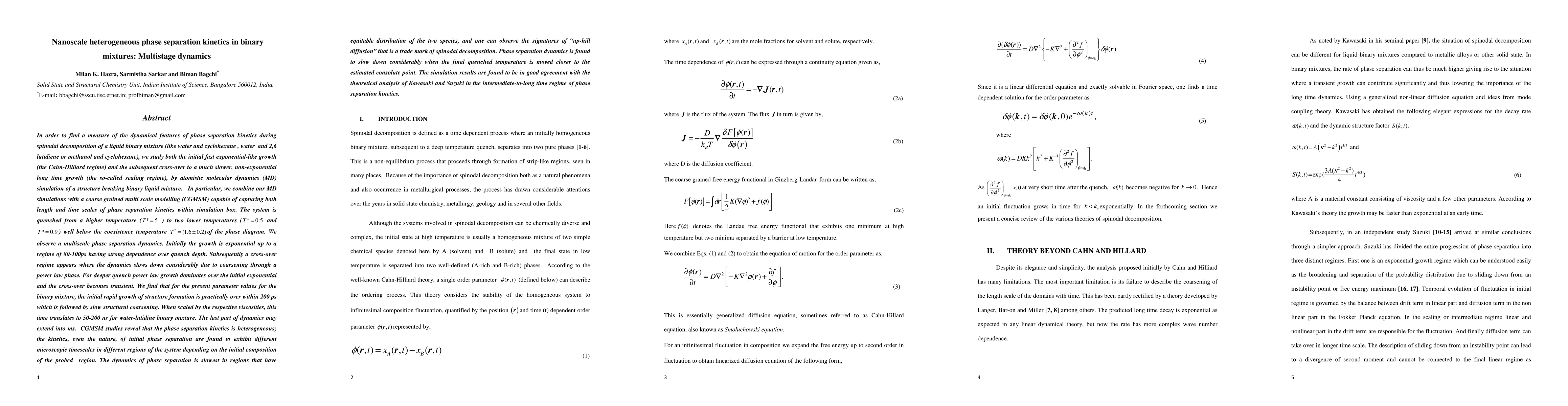 This paper investigates the kinetics of phase separation in binary liquid mixtures using atomistic molecular dynamics simulations and coarse-grained multiscale modeling. It reveals a multistage phase separation process, starting with rapid exponential growth followed by a slower power law regime, with the transition influenced by the quench depth and mixture composition.