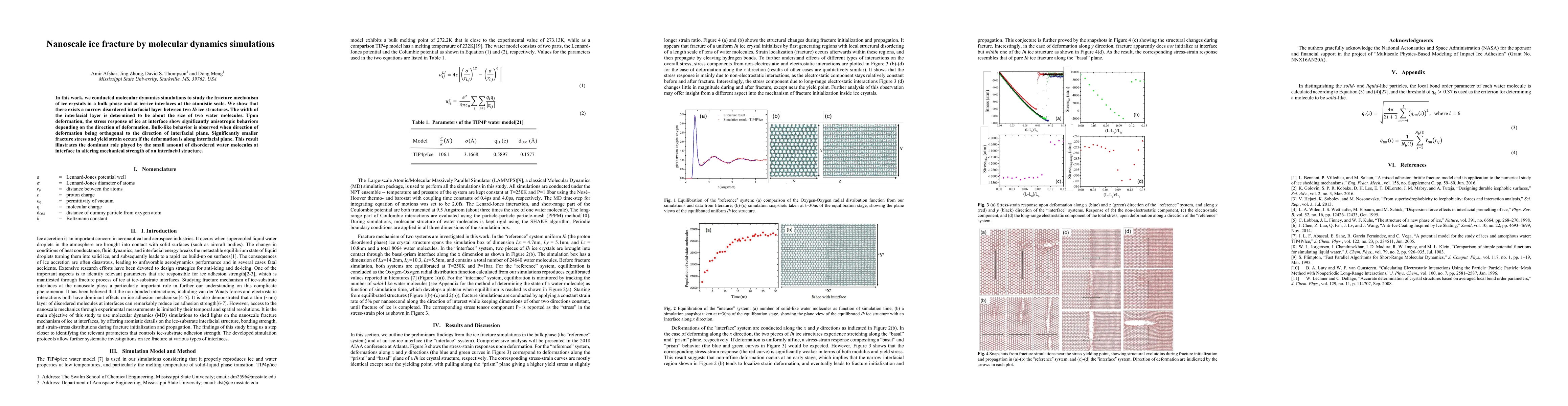 Researchers used molecular dynamics simulations to study ice fracture at the nanoscale, finding a narrow disordered interfacial layer between ice crystals that significantly affects their mechanical strength.