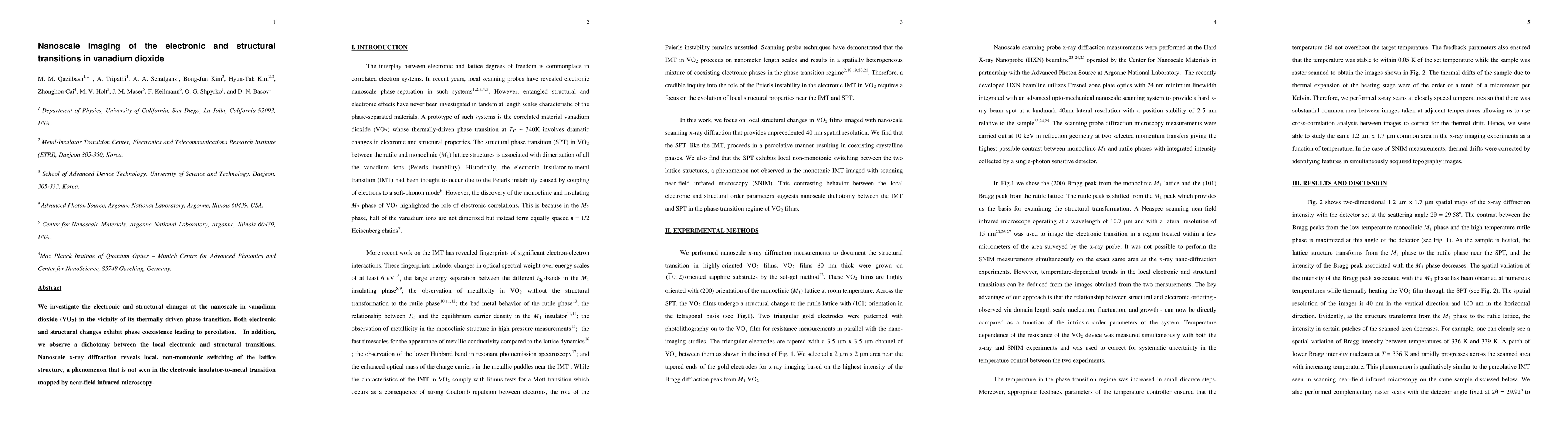 This study reveals nanoscale electronic and structural transitions in vanadium dioxide (VO2) during its phase change, showing coexistence and percolation due to these transitions. Nanoscale x-ray diffraction identifies non-monotonic lattice changes, while near-field infrared microscopy highlights a different electronic insulator-to-metal transition, indicating a local dichotomy between electronic and structural shifts.