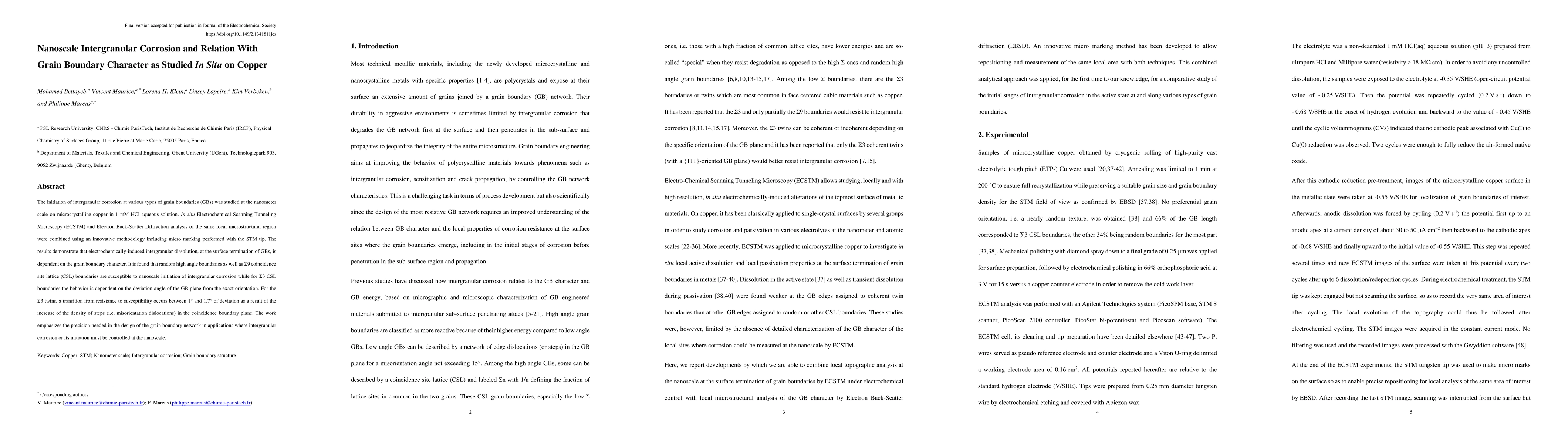 The initiation of intergranular corrosion at various types of grain boundaries (GBs) was studied at the nanometer scale on microcrystalline copper in 1 mM HCl aqueous solution. In situ Electrochemical Scanning Tunneling Microscopy (ECSTM) and Electron Back-Scatter Diffraction analysis of the same local microstructural region were combined using an innovative methodology including micro marking performed with the STM tip. The results demonstrate that electrochemically-induced intergranular dissolution, at the surface termination of GBs, is dependent on the grain boundary character. It is found that random high angle boundaries as well as sigma9 coincidence site lattice (CSL) boundaries are susceptible to nanoscale initiation of intergranular corrosion while for sigma3 CSL boundaries the behavior is dependent on the deviation angle of the GB plane from the exact orientation. For the sigma3 twins, a transition from resistance to susceptibility occurs between 1{\deg} and 1.7{\deg} of deviation as a result of the increase of the density of steps (i.e. misorientation dislocations) in the coincidence boundary plane. The work emphasizes the precision needed in the design of the grain boundary network in applications where intergranular corrosion or its initiation must be controlled at the nanoscale.