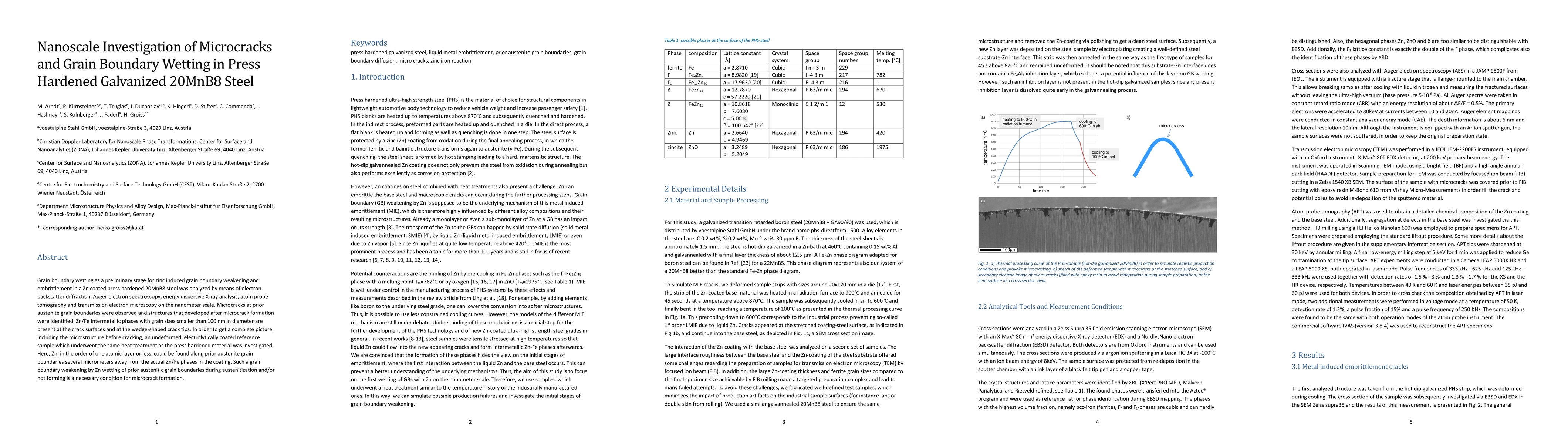 This study investigates zinc-induced grain boundary weakening and microcrack formation in press hardened galvanized 20MnB8 steel using advanced nanoscale techniques. Zn/Fe intermetallic phases were found at microcrack sites, indicating that Zn wetting of grain boundaries is a precursor to embrittlement and microcracking.