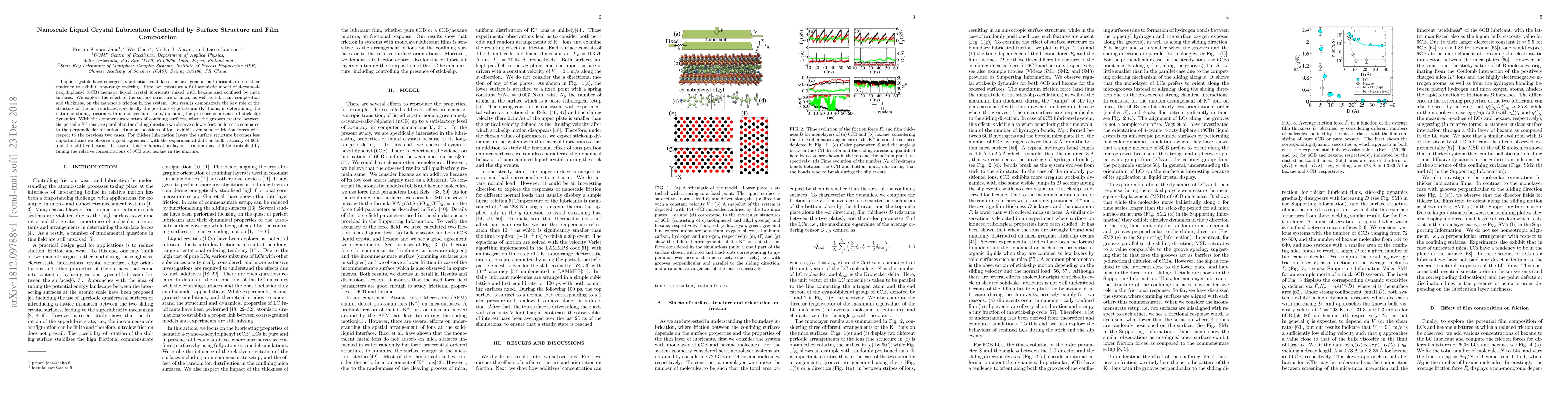 This research constructs an atomistic model of nematic liquid crystal lubricants to investigate nanoscale friction influenced by mica surface structure and lubricant composition. The study reveals that the arrangement of potassium ions on mica surfaces significantly affects friction, with lower friction observed when grooves align with the sliding direction.
