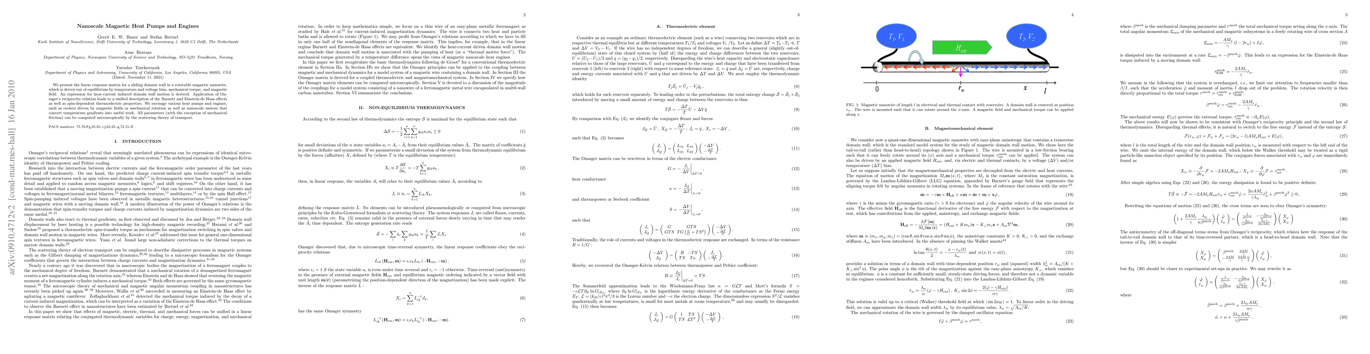 This paper develops a linear response matrix for a domain wall in a magnetic nanowire, driven by temperature, voltage, mechanical torque, and magnetic field, to describe nanoscale magnetic heat pumps and engines. It unifies the Barnett and Einstein-de Haas effects and explores applications like magnetic field-driven coolers and nanoscale motors.