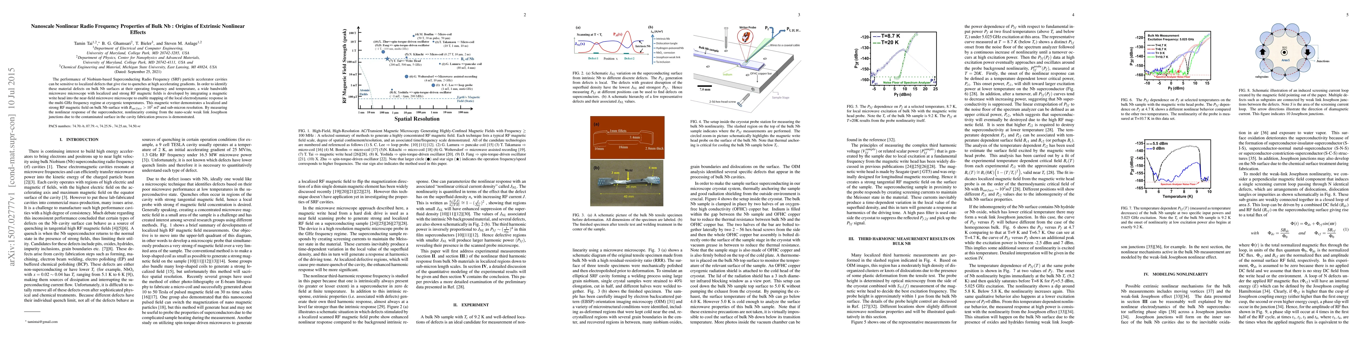 This paper investigates the nanoscale nonlinear RF properties of bulk Nb used in superconducting RF particle accelerators, identifying extrinsic nonlinear effects from surface contamination. A wide-bandwidth microwave microscope with a magnetic write head is used to map the local electrodynamic response at cryogenic temperatures, revealing the influence of nano-scale weak link Josephson junctions.