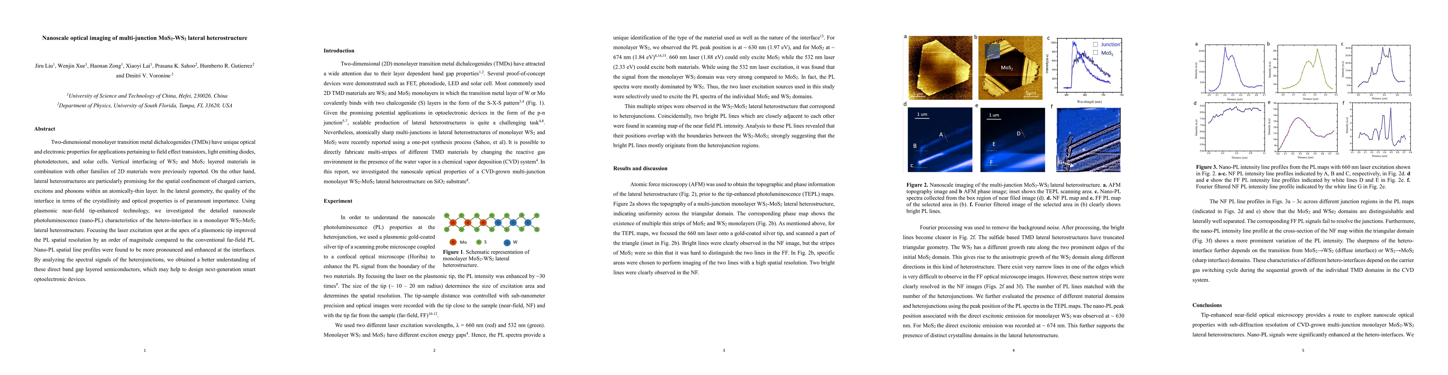 Two-dimensional monolayer transition metal dichalcogenides (TMDs) have unique optical and electronic properties for applications pertaining to field effect transistors, light emitting diodes, photodetectors, and solar cells. Vertical interfacing of WS2 and MoS2 layered materials in combination with other families of 2D materials were previously reported. On the other hand, lateral heterostructures are particularly promising for the spatial confinement of charged carriers, excitons and phonons within an atomically-thin layer. In the lateral geometry, the quality of the interface in terms of the crystallinity and optical properties is of paramount importance. Using plasmonic near-field tip-enhanced technology, we investigated the detailed nanoscale photoluminescence (nano-PL) characteristics of the hetero-interface in a monolayer WS2-MoS2 lateral heterostructure. Focusing the laser excitation spot at the apex of a plasmonic tip improved the PL spatial resolution by an order of magnitude compared to the conventional far-field PL. Nano-PL spatial line profiles were found to be more pronounced and enhanced at the interfaces. By analyzing the spectral signals of the heterojunctions, we obtained a better understanding of these direct band gap layered semiconductors, which may help to design next-generation smart optoelectronic devices.
