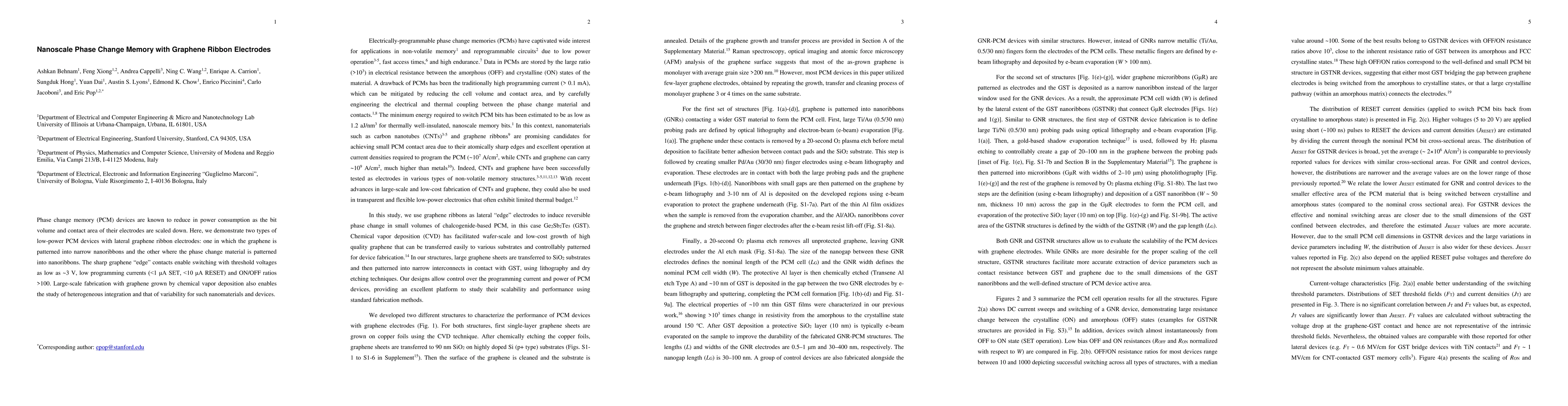 This paper demonstrates low-power nanoscale phase change memory devices using graphene ribbon electrodes, achieving low threshold voltages and programming currents while maintaining high ON/OFF ratios, with potential for large-scale fabrication and integration.