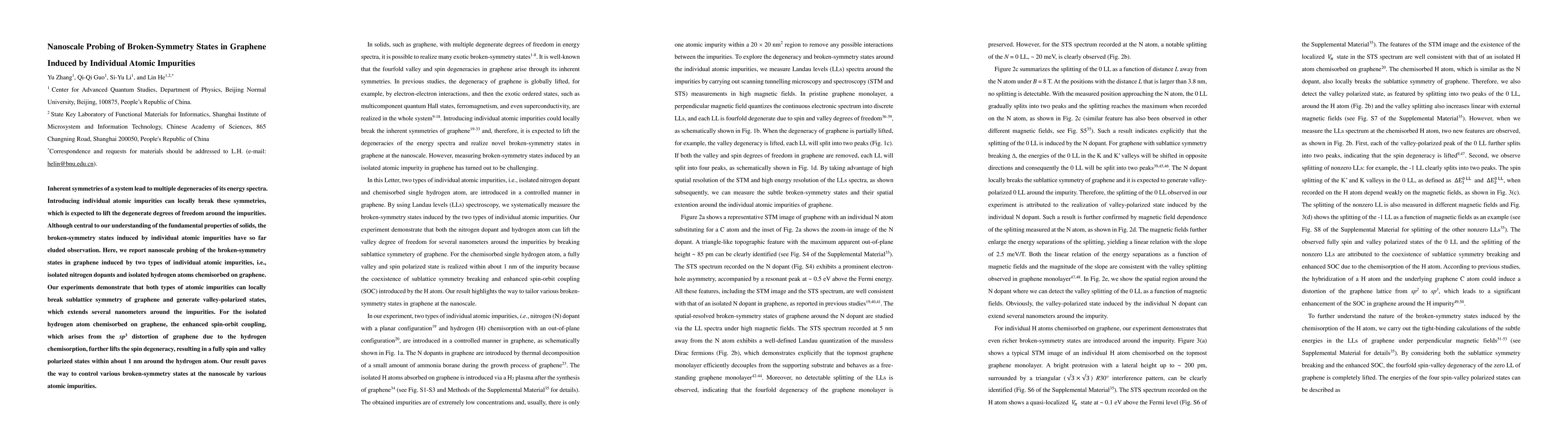 This paper reports nanoscale probing of broken-symmetry states in graphene induced by isolated nitrogen dopants and hydrogen atoms, revealing that both can locally break sublattice symmetry and generate valley-polarized states. The hydrogen atoms additionally cause spin-orbit coupling, resulting in fully spin and valley polarized states within a 1 nm radius.