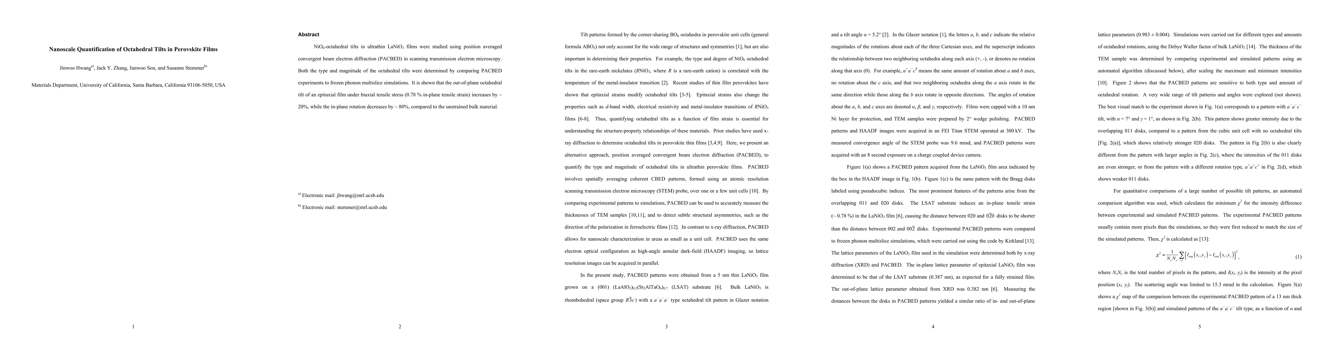 This study uses PACBED in scanning transmission electron microscopy to quantify the nanoscale octahedral tilts in ultrathin LaNiO3 films, revealing a 20% increase in out-of-plane tilt and an 80% decrease in in-plane rotation under biaxial tensile stress compared to unstrained bulk material.