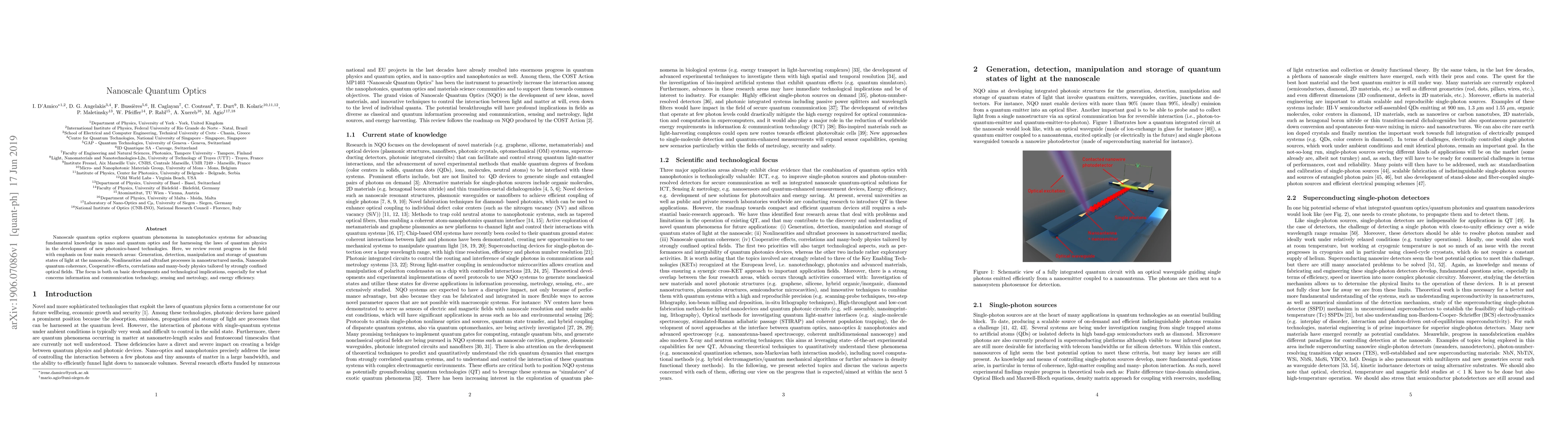 This paper reviews advancements in nanoscale quantum optics, focusing on generating, detecting, manipulating, and storing quantum states of light at the nanoscale. It highlights nonlinearities, ultrafast processes, quantum coherence, and many-body physics in nanostructured media, with implications for information technology, sensing, metrology, and energy efficiency.