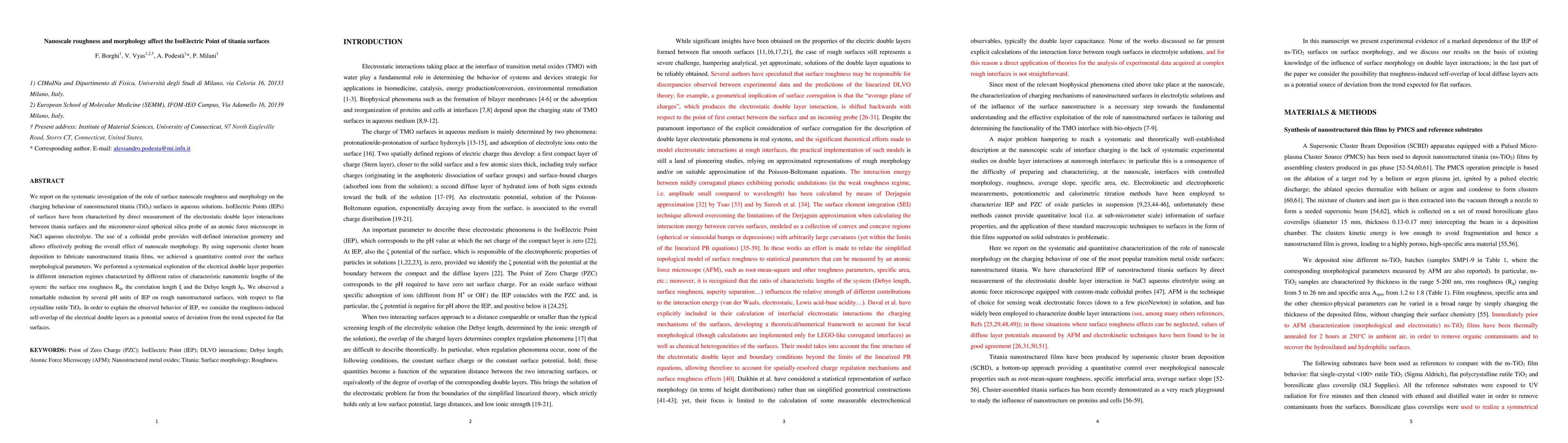This study investigates how nanoscale roughness and morphology influence the IsoElectric Point (IEP) of titania surfaces in aqueous solutions. Using atomic force microscopy with colloidal probes, researchers found that rough nanostructured titania surfaces exhibit a significantly lower IEP compared to flat rutile TiO2, attributing the effect to roughness-induced self-overlap of electrical double layers.