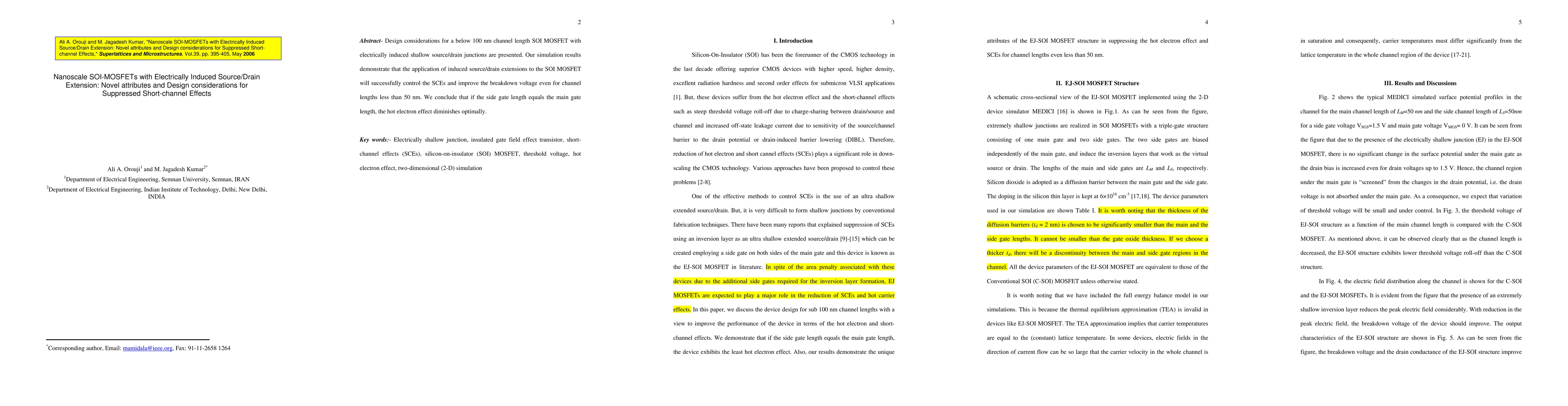 Design considerations for a below 100 nm channel length SOI MOSFET with electrically induced shallow source/drain junctions are presented. Our simulation results demonstrate that the application of induced source/drain extensions to the SOI MOSFET will successfully control the SCEs and improve the breakdown voltage even for channel lengths less than 50 nm. We conclude that if the side gate length equals the main gate length, the hot electron effect diminishes optimally.