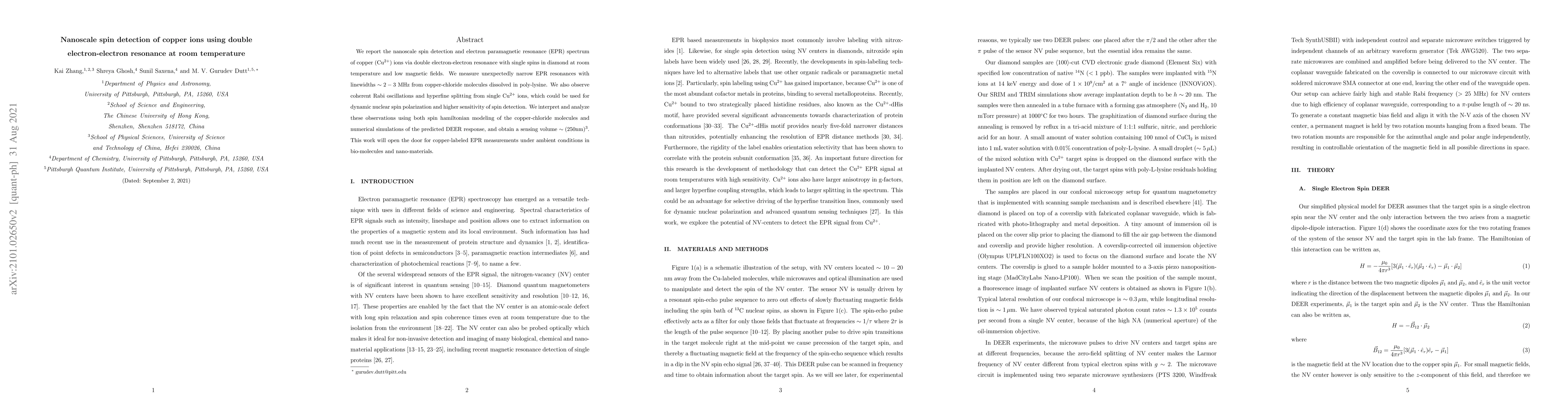 The development and application of DEER with single spins in diamond for nanoscale spin detection of copper ions at room temperature and low magnetic fields.