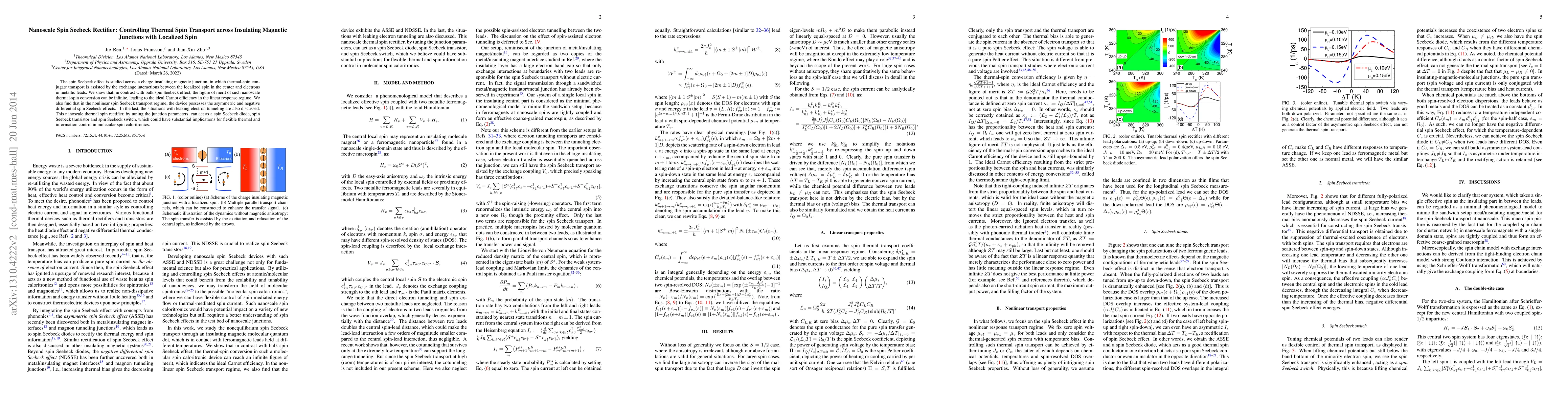 The spin Seebeck effect is studied across a charge insulating magnetic junction, in which thermal-spin conjugate transport is assisted by the exchange interactions between the localized spin in the center and electrons in metallic leads. We show that, in contrast with bulk spin Seebeck effect, the figure of merit of such nanoscale thermal-spin conversion can be infinite, leading to the ideal Carnot efficiency in the linear response regime. We also find that in the nonlinear spin Seebeck transport regime, the device possesses the asymmetric and negative differential spin Seebeck effects. In the last, the situations with leaking electron tunneling are also discussed. This nanoscale thermal spin rectifier, by tuning the junction parameters, can act as a spin Seebeck diode, spin Seebeck transistor and spin Seebeck switch, which could have substantial implications for flexible thermal and information control in molecular spin caloritronics.
