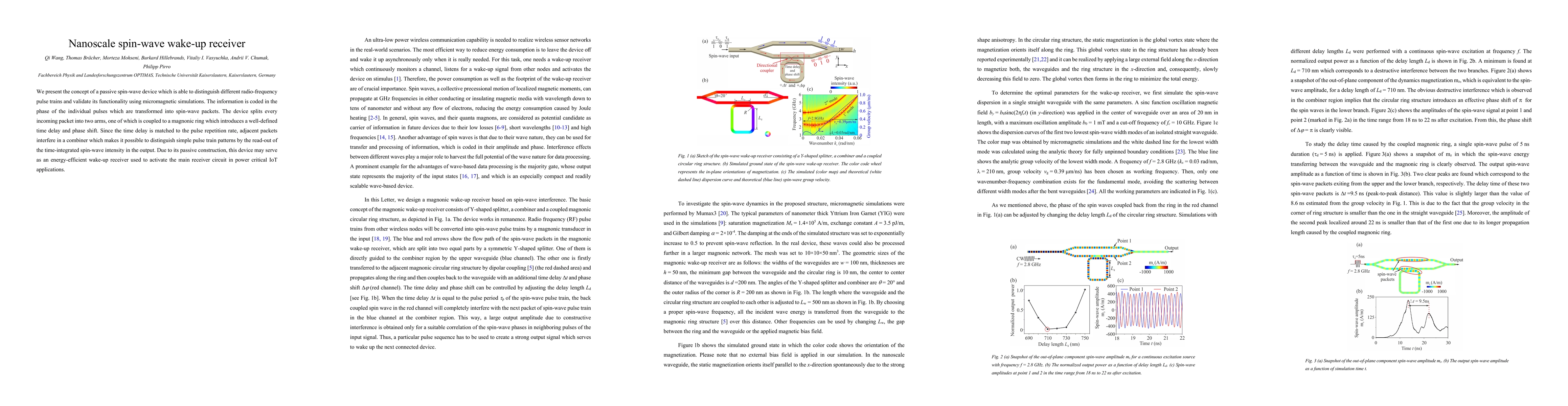 This paper introduces a passive nanoscale spin-wave device that distinguishes radio-frequency pulse trains by transforming pulses into spin-wave packets and using interference to identify patterns. Its energy-efficient design makes it suitable for activating main receiver circuits in power-critical IoT applications.