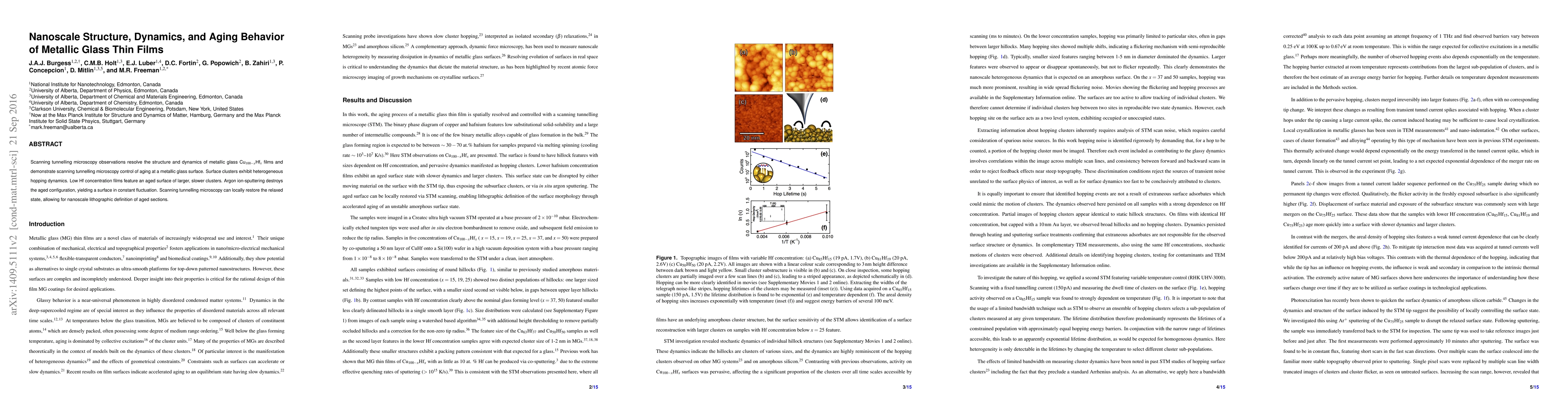 This paper uses scanning tunneling microscopy to investigate the nanoscale structure and dynamics of Cu$_{100-x}$Hf$_{x}$ metallic glass thin films, revealing heterogeneous hopping dynamics and demonstrating STM control over aging behavior, with low Hf concentration films showing larger, slower clusters in aged states. Argon ion-sputtering resets the aged configuration, while STM can restore the relaxed state, enabling nanoscale lithographic definition of aged sections.