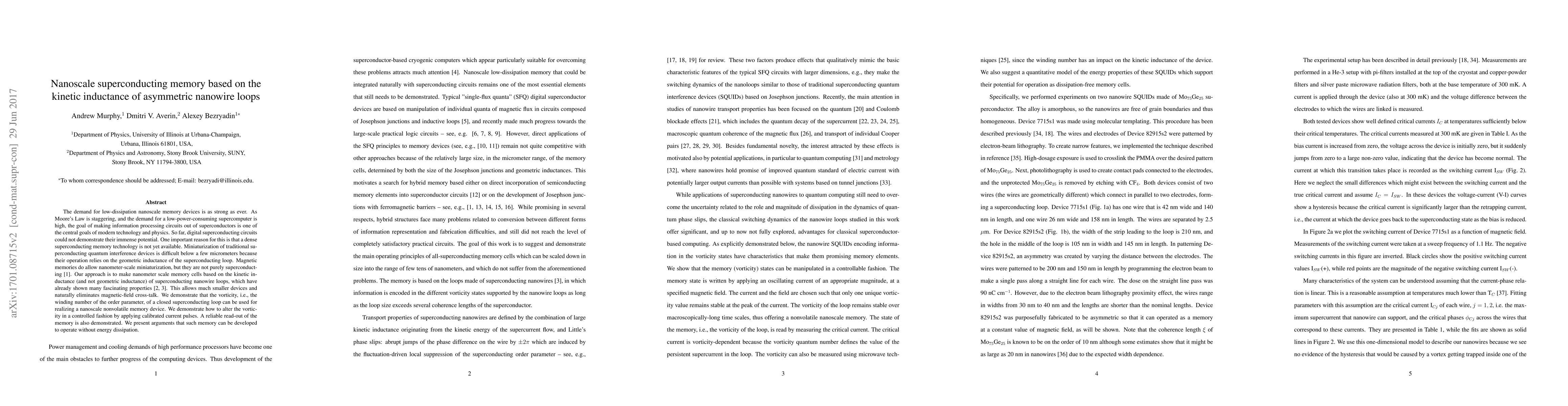 This paper proposes a nanoscale superconducting memory device based on the kinetic inductance of asymmetric nanowire loops, aiming to overcome the limitations of traditional superconducting quantum interference devices. The authors demonstrate a nonvolatile memory using the vorticity of a superconducting loop, showing controlled alteration and reliable readout, with potential for low-dissipation operation.