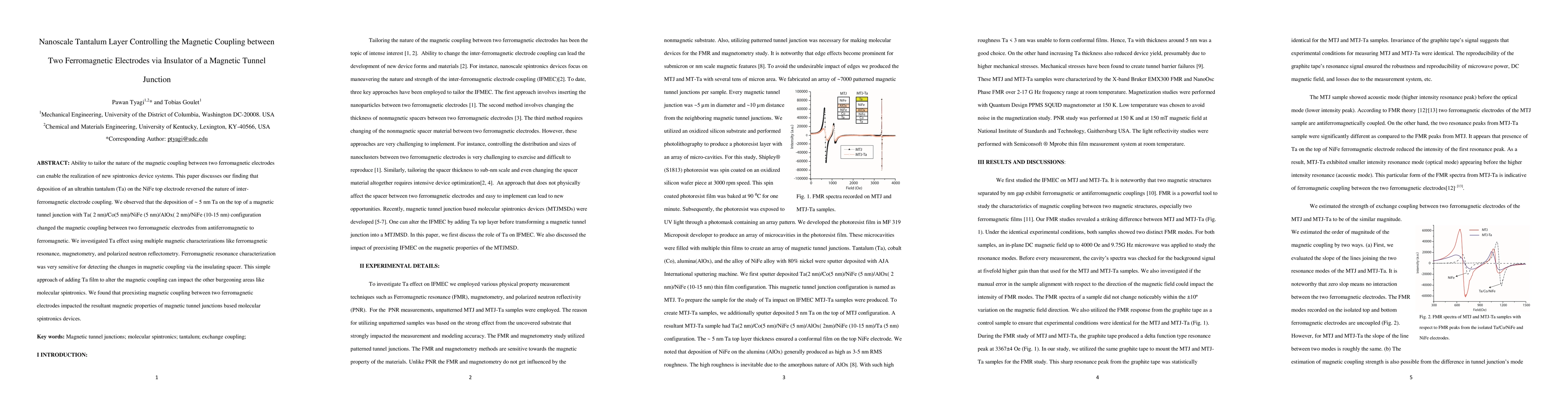 Ability to tailor the nature of the magnetic coupling between two ferromagnetic electrodes can enable the realization of new spintronics device systems. This paper discusses our finding that deposition of an ultrathin tantalum (Ta) on the NiFe top electrode reversed the nature of inter-ferromagnetic electrode coupling. We observed that the deposition of ~ 5 nm Ta on the top of a magnetic tunnel junction with Ta( 2 nm)/Co(5 nm)/NiFe (5 nm)/AlOx( 2 nm)/NiFe (10-15 nm) configuration changed the magnetic coupling between two ferromagnetic electrodes from antiferromagnetic to ferromagnetic. We investigated Ta effect using multiple magnetic characterizations like ferromagnetic resonance, magnetometry, and polarized neutron reflectometry. Ferromagnetic resonance characterization was very sensitive for detecting the changes in magnetic coupling via the insulating spacer. This simple approach of adding Ta film to alter the magnetic coupling can impact the other burgeoning areas like molecular spintronics. We found that preexisting magnetic coupling between two ferromagnetic electrodes impacted the resultant magnetic properties of magnetic tunnel junctions based molecular spintronics devices.