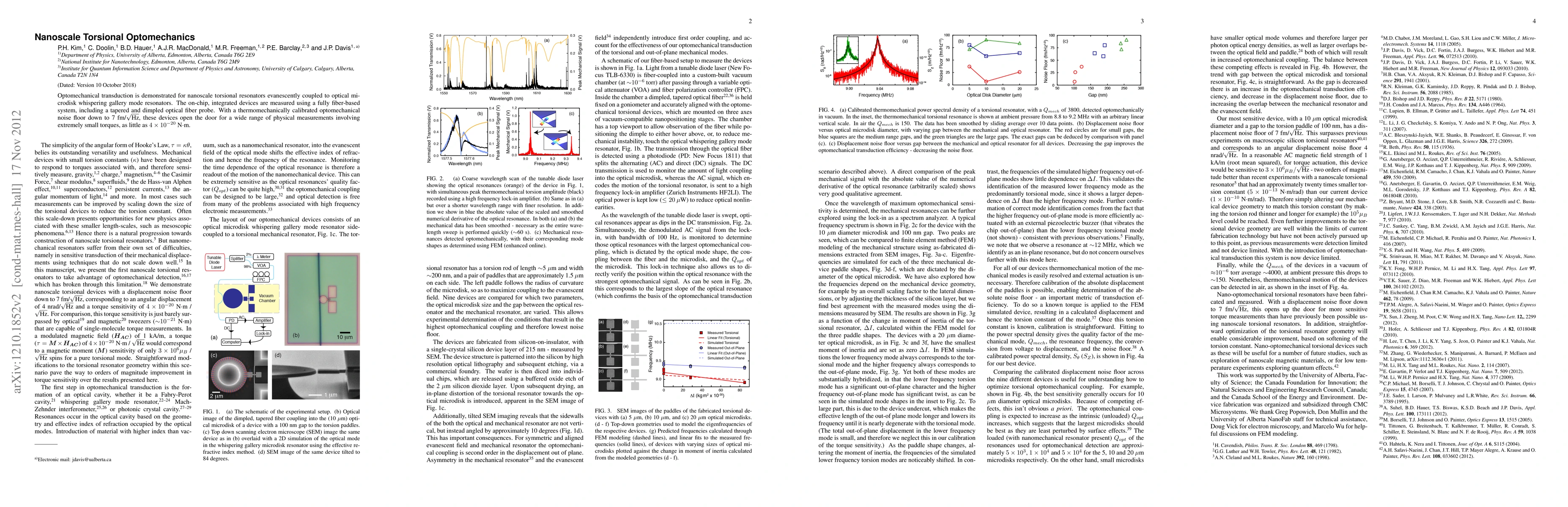 Optomechanical transduction is demonstrated for nanoscale torsional resonators evanescently coupled to optical microdisk whispering gallery mode resonators. The on-chip, integrated devices are measured using a fully fiber-based system, including a tapered and dimpled optical fiber probe. With a thermomechanically calibrated optomechanical noise floor down to 7 fm/sqrt(Hz), these devices open the door for a wide range of physical measurements involving extremely small torques, as little as 4x10^-20 N*m.