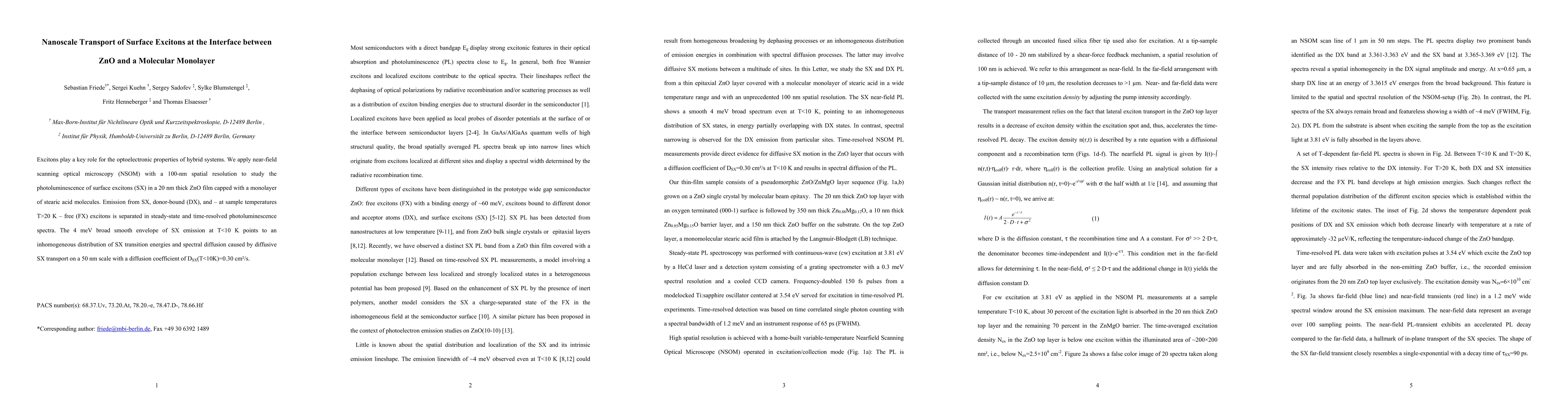 Excitons play a key role for the optoelectronic properties of hybrid systems. We apply near-field scanning optical microscopy (NSOM) with a $100\,\text{-nm}$ spatial resolution to study the photoluminescence of surface excitons (SX) in a $20\,\text{nm}$ thick ZnO film capped with a monolayer of stearic acid molecules. Emission from SX, donor-bound (DX), and - at sample temperatures $T>20\,\text{K}$ - free (FX) excitons is separated in steady-state and time-resolved photoluminescence spectra. The $4\,\text{meV}$ broad smooth envelope of SX emission at $T<10\,\text{K}$ points to an inhomogeneous distribution of SX transition energies and spectral diffusion caused by diffusive SX transport on a $50\,\text{nm}$ scale with a SX diffusion coefficient of $D(T<10 K)=0.30\,\text{cm$^2$/s}$.