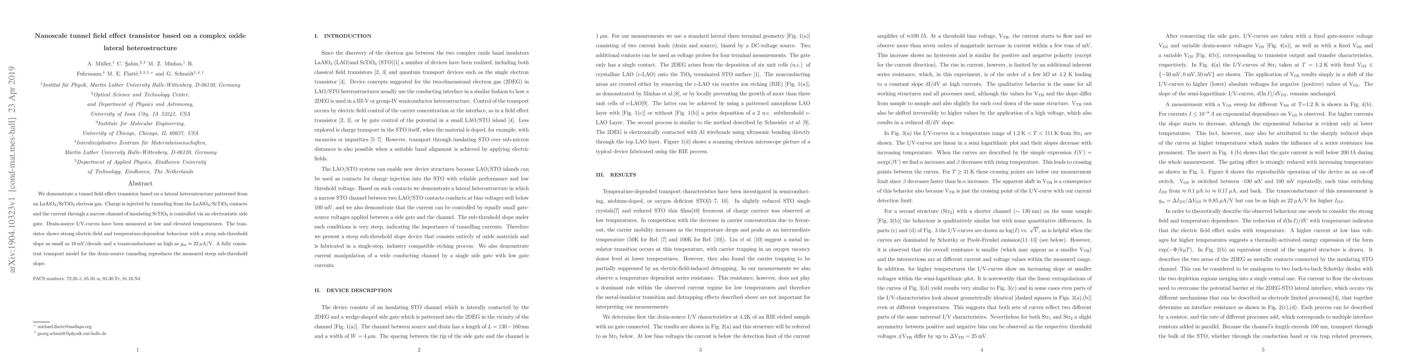 This paper demonstrates a nanoscale tunnel field effect transistor utilizing a lateral heterostructure of $\mathrm{LaAlO_3/SrTiO_3}$, where charge tunneling and current control are achieved via an electrostatic side gate. The device exhibits a steep sub-threshold slope and high transconductance, showcasing strong electric-field and temperature-dependent behavior.