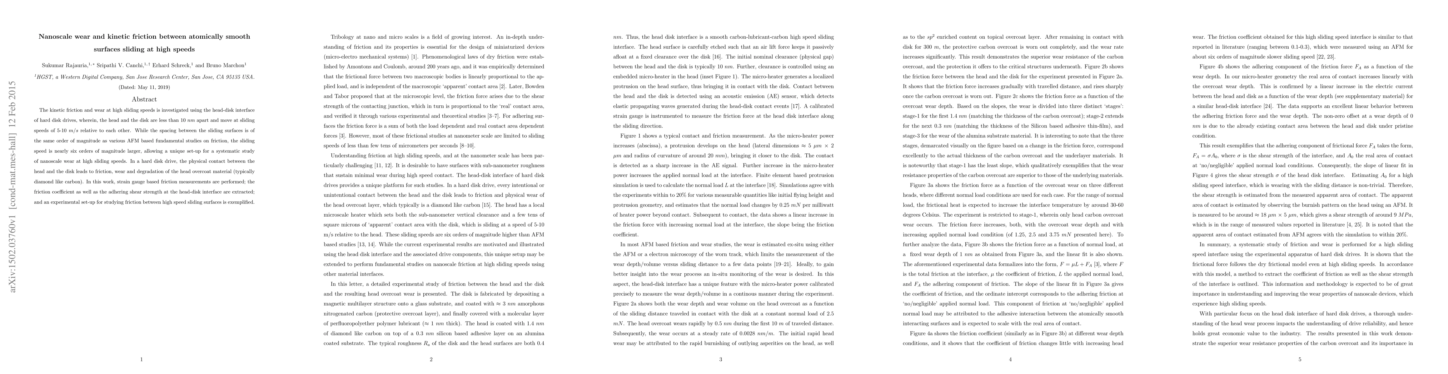 The kinetic friction and wear at high sliding speeds is investigated using the head-disk interface of hard disk drives, wherein, the head and the disk are less than 10 nm apart and move at sliding speeds of 5-10 m/s relative to each other. While the spacing between the sliding surfaces is of the same order of magnitude as various AFM based fundamental studies on friction, the sliding speed is nearly six orders of magnitude larger, allowing a unique set-up for a systematic study of nanoscale wear at high sliding speeds. In a hard disk drive, the physical contact between the head and the disk leads to friction, wear and degradation of the head overcoat material (typically diamond like carbon). In this work, strain gauge based friction measurements are performed; the friction coefficient as well as the adhering shear strength at the head-disk interface are extracted; and an experimental set-up for studying friction between high speed sliding surfaces is exemplified.