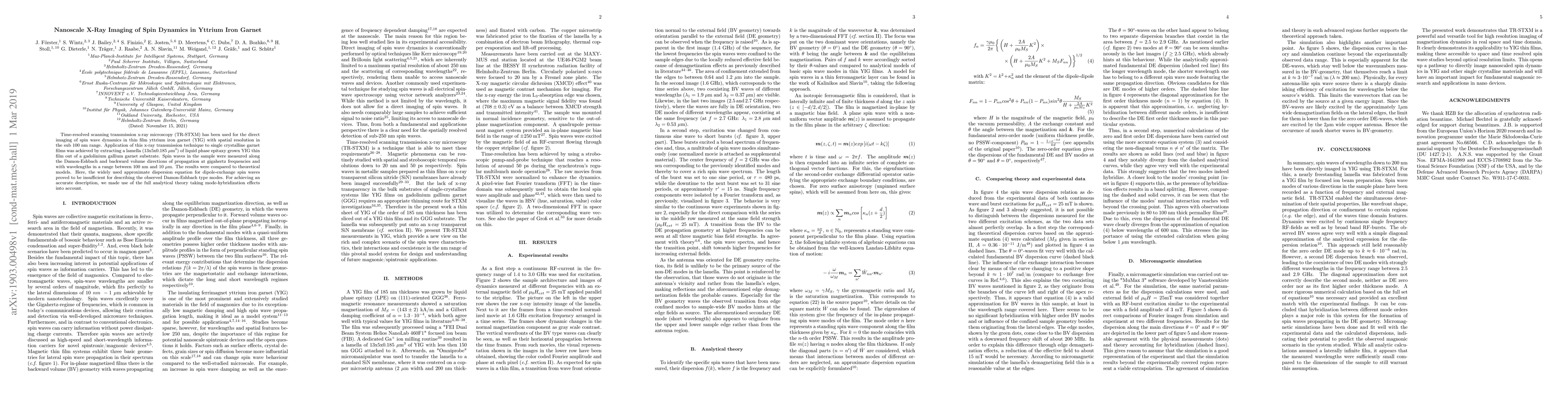 This paper employs time-resolved scanning transmission x-ray microscopy to directly image spin wave dynamics in sub 100 nm Yttrium Iron Garnet thin films, revealing discrepancies between observed spin wave modes and theoretical models. Accurate descriptions require considering full analytical theory with mode-hybridization effects.