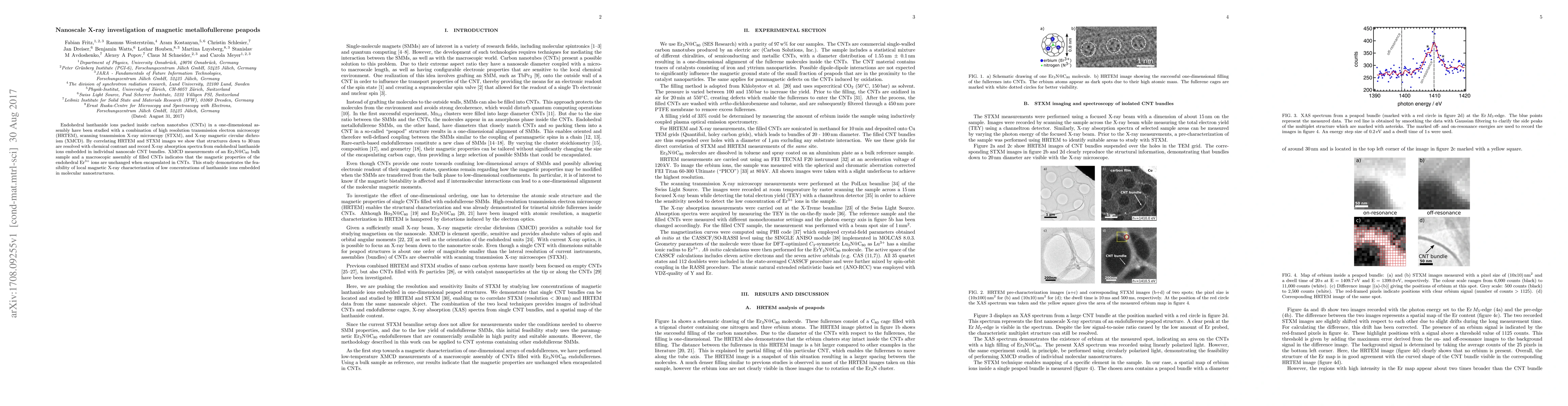 Endohedral lanthanide ions packed inside carbon nanotubes (CNTs) in a one-dimensional assembly have been studied with a combination of high resolution transmission electron microscopy (HRTEM), scanning transmission X-ray microscopy (STXM), and X-ray magnetic circular dichroism (XMCD). By correlating HRTEM and STXM images we show that structures down to 30 nm are resolved with chemical contrast and record X-ray absorption spectra from endohedral lanthanide ions embedded in individual nanoscale CNT bundles. XMCD measurements of an Er$_3$N@C$_{80}$ bulk sample and a macroscopic assembly of filled CNTs indicates that the magnetic properties of the endohedral Er3+ ions are unchanged when encapsulated in CNTs. This study demonstrates the feasibility of local magnetic X-ray characterization of low concentrations of lanthanide ions embedded in molecular nanostructures.