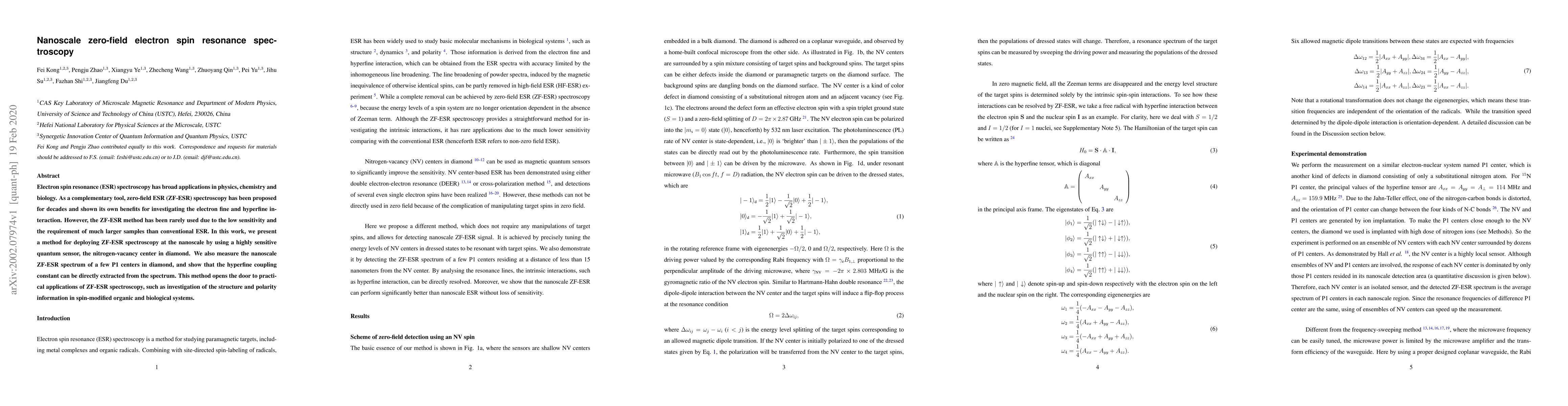 This paper introduces a nanoscale zero-field electron spin resonance (ZF-ESR) spectroscopy method using nitrogen-vacancy centers in diamond, significantly enhancing sensitivity. It demonstrates the feasibility of extracting hyperfine coupling constants from nanoscale ZF-ESR spectra, paving the way for applications in studying organic and biological systems.