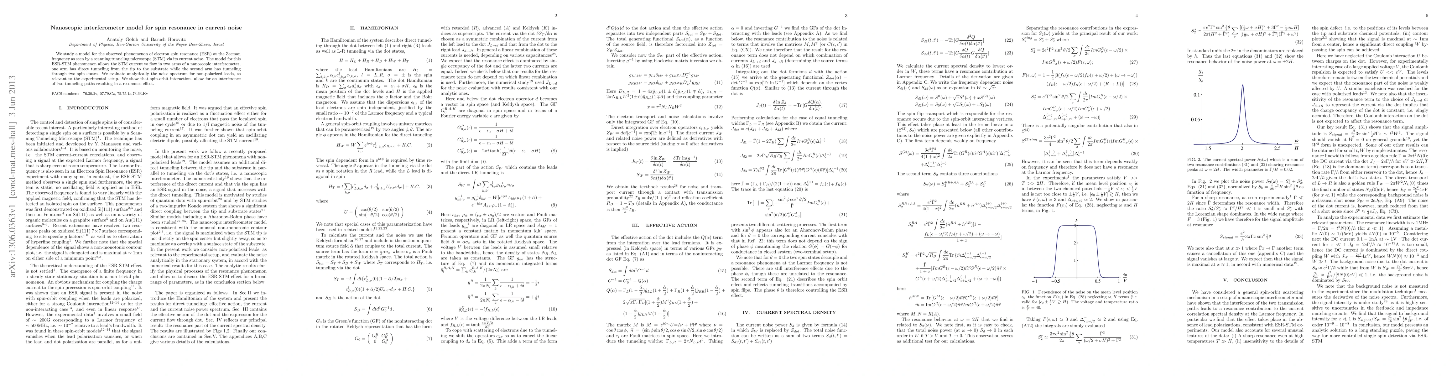 We study a model for the observed phenomenon of electron spin resonance (ESR) at the Zeeman frequency as seen by a scanning tunneling microscope (STM) via its current noise. The model for this ESR-STM phenomenon allows the STM current to flow in two arms of a nanoscopic interferometer, one arm has direct tunneling from the tip to the substrate while the second arm has tunneling through two spin states. We evaluate analytically the noise spectrum for non-polarized leads, as relevant to the experimental setup. We show that spin-orbit interactions allow for an interference of two tunneling paths resulting in a resonance effect.
