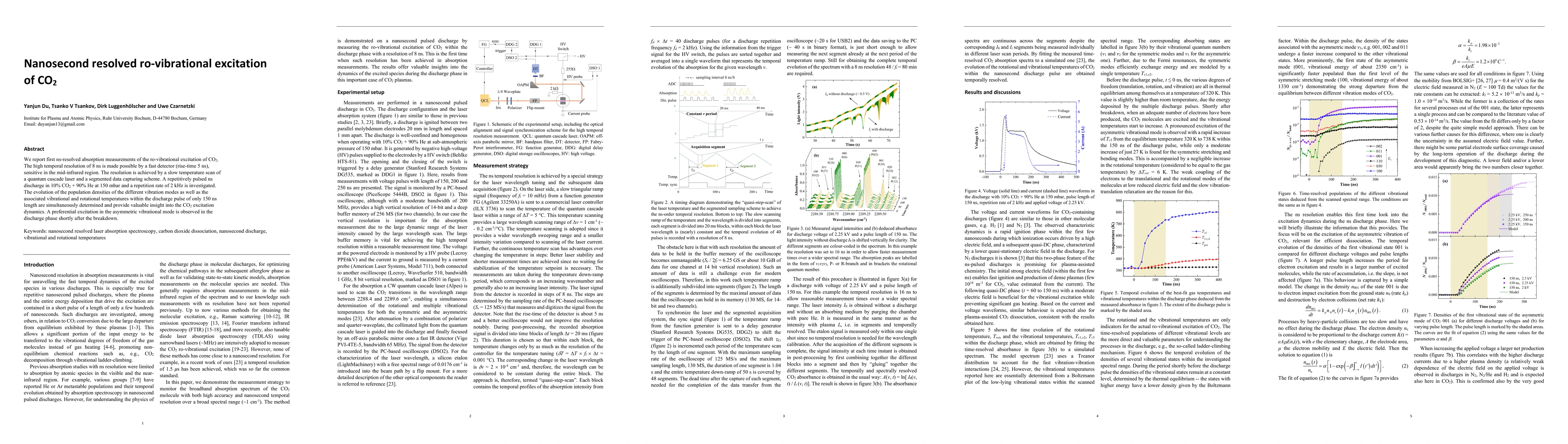 We report first ns-resolved absorption measurements of the ro-vibrational excitation of CO$_2$. The high temporal resolution of 8 ns is made possible by a fast detector (rise-time 5 ns), sensitive in the mid-infrared region. The resolution is achieved by a slow temperature scan of a quantum cascade laser and a segmented data capturing scheme. A repetitively pulsed ns discharge in 10% CO$_2$ + 90% He at 150 mbar and a repetition rate of 2 kHz is investigated. The evolution of the population densities of the different vibration modes as well as the associated vibrational and rotational temperatures within the discharge pulse of only 150 ns length are simultaneously determined and provide valuable insight into the CO$_2$ excitation dynamics. A preferential excitation in the asymmetric vibrational mode is observed in the discharge phase shortly after the breakdown.