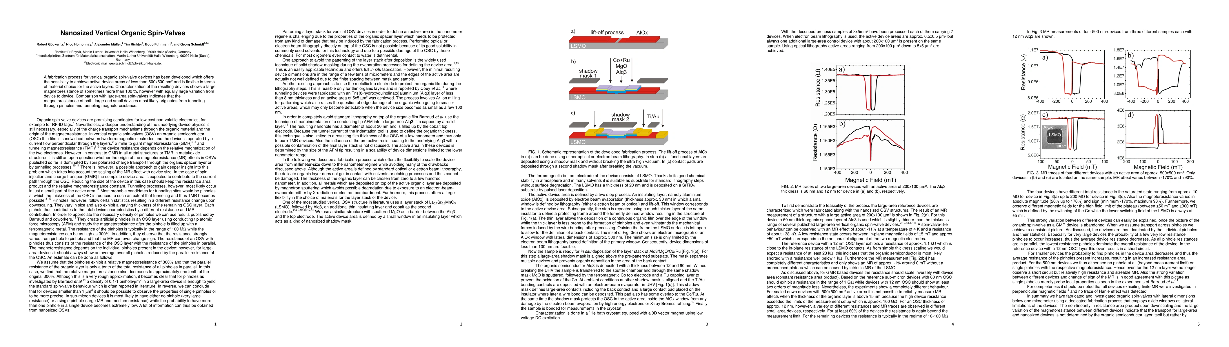 The paper details a novel fabrication method for vertical organic spin-valves that allows for compact device areas below 500x500 nm^2 and flexible material selection. Despite achieving high magnetoresistance exceeding 100%, significant device-to-device variation is noted, suggesting similar mechanisms to those in larger devices, primarily tunneling through pinholes.