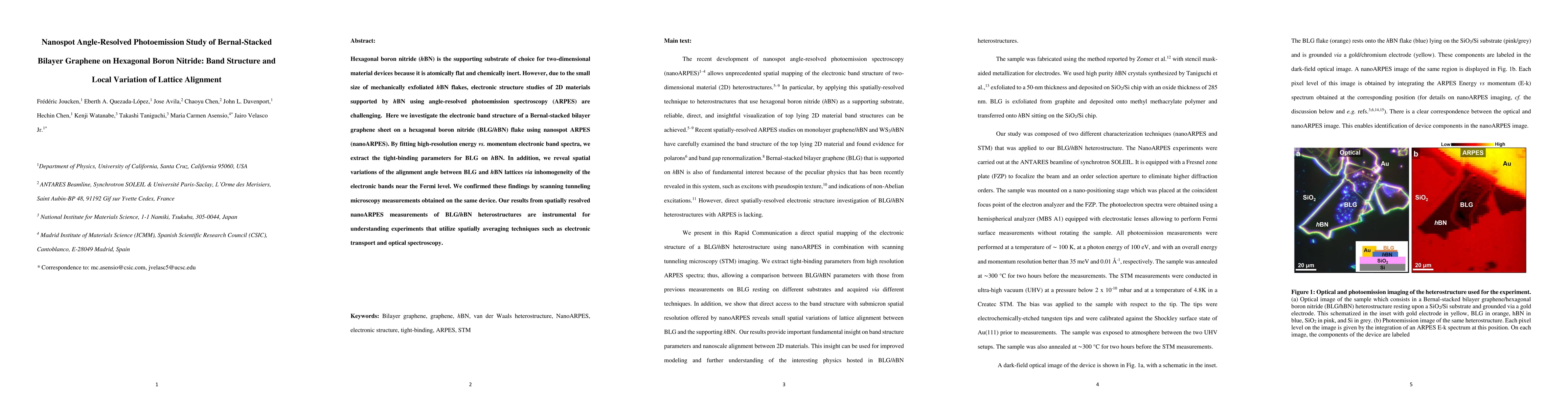This study uses nanospot angle-resolved photoemission spectroscopy to investigate the electronic band structure and lattice alignment of Bernal-stacked bilayer graphene on hexagonal boron nitride. The research reveals local variations in the lattice alignment between the graphene and substrate layers, providing crucial insights for spatially averaged experiments.