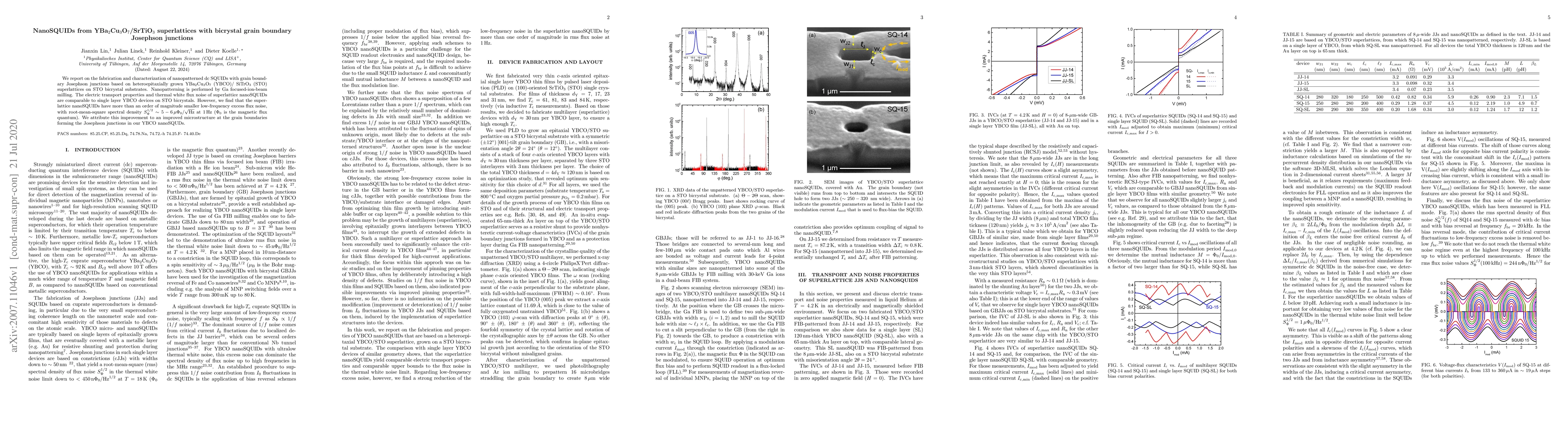 This paper details the fabrication of nanopatterned dc SQUIDs using YBa$_2$Cu$_3$O$_7$/SrTiO$_3$ superlattices on bicrystal substrates, showing significantly reduced low-frequency flux noise compared to single layer devices, attributed to enhanced microstructure at the grain boundary Josephson junctions.