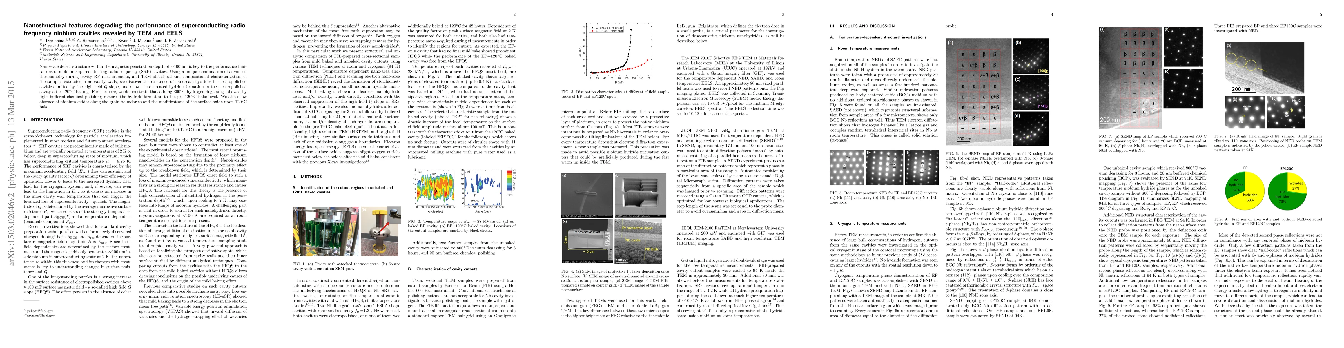 This paper investigates nanoscale defects, specifically hydrides, within niobium superconducting radio frequency cavities using TEM and EELS, revealing that hydrides degrade cavity performance. Post-120°C baking reduces hydride formation, while 800°C hydrogen degassing followed by light polishing restores hydride levels, indicating a method to improve cavity performance.