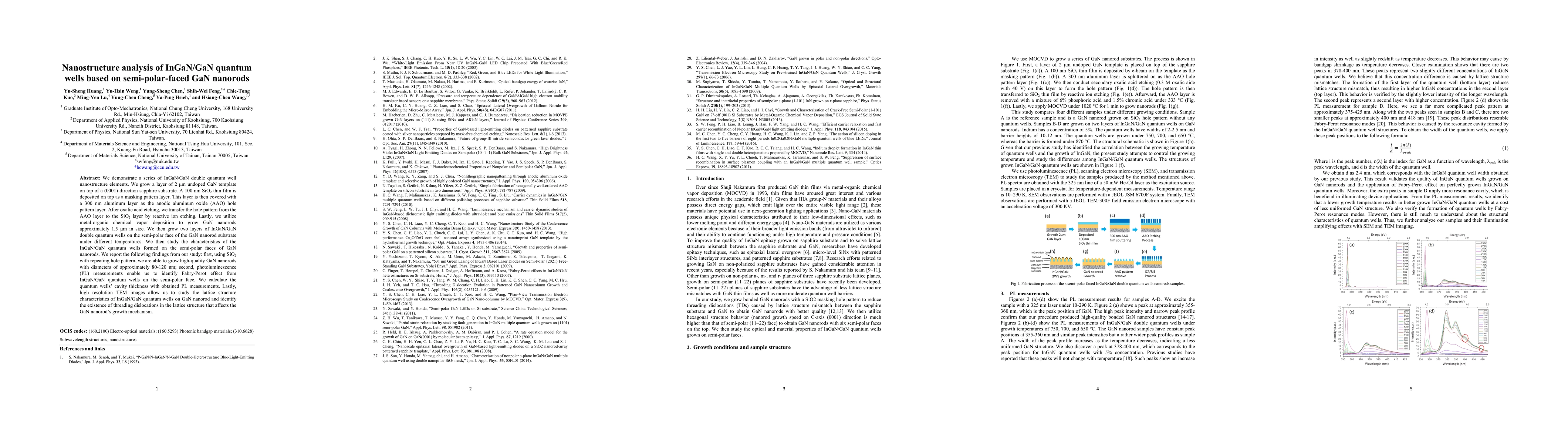This research grows high-quality InGaN/GaN double quantum well nanostructures on semi-polar-faced GaN nanorods, demonstrating a method for fabricating the nanorods with precise control over their diameters. Photoluminescence analysis reveals the Fabry-Perot effect and cavity thickness, while TEM images show threading dislocations affecting growth.
