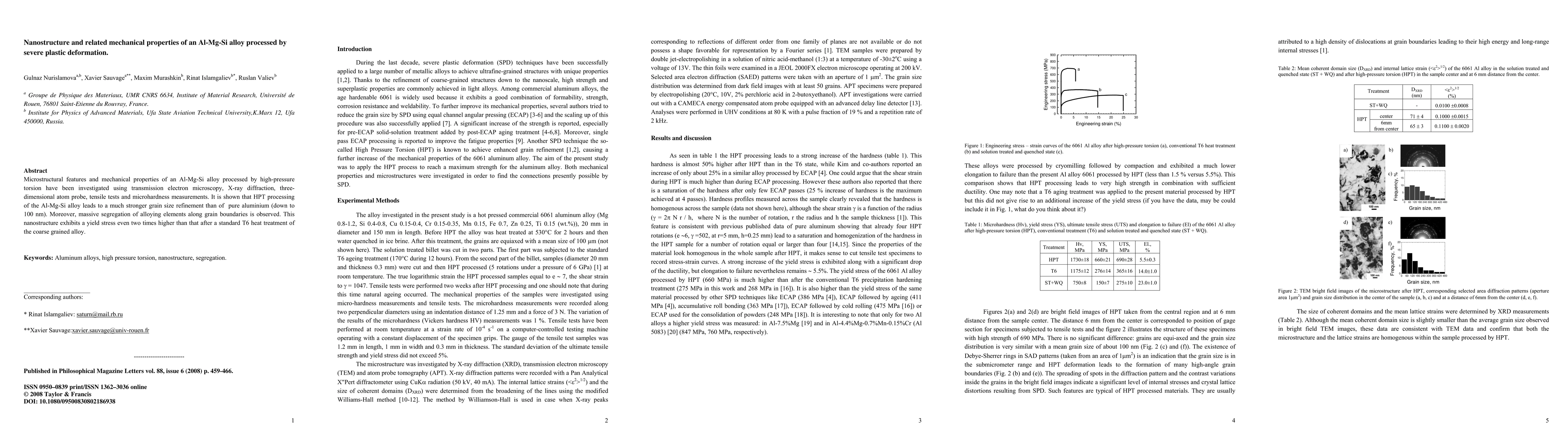 Microstructural features and mechanical properties of an Al-Mg-Si alloy processed by high-pressure torsion have been investigated using transmission electron microscopy, X-ray diffraction, three-dimensional atom probe, tensile tests and microhardness measurements. It is shown that HPT processing of the Al-Mg-Si alloy leads to a much stronger grain size refinement than of pure aluminium (down to 100 nm). Moreover, massive segregation of alloying elements along grain boundaries is observed. This nanostructure exhibits a yield stress even two times higher than that after a standard T6 heat treatment of the coarse grained alloy